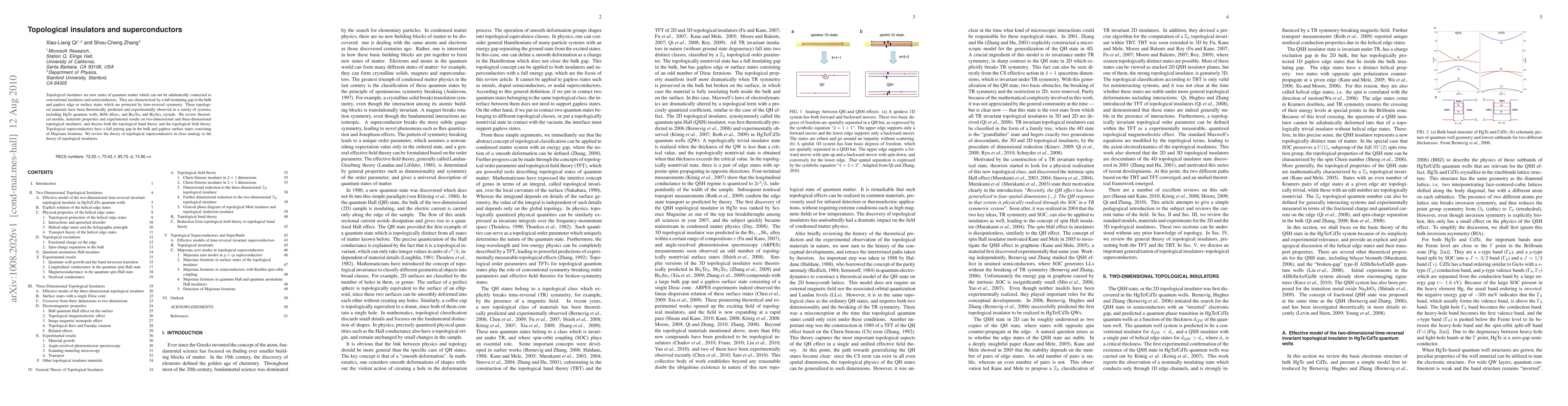Topological insulators are new states of quantum matter which can not be adiabatically connected to conventional insulators and semiconductors. They are characterized by a full insulating gap in the bulk and gapless edge or surface states which are protected by time-reversal symmetry. These topological materials have been theoretically predicted and experimentally observed in a variety of systems, including HgTe quantum wells, BiSb alloys, and Bi$_2$Te$_3$ and Bi$_2$Se$_3$ crystals. We review theoretical models, materials properties and experimental results on two-dimensional and three-dimensional topological insulators, and discuss both the topological band theory and the topological field theory. Topological superconductors have a full pairing gap in the bulk and gapless surface states consisting of Majorana fermions. We review the theory of topological superconductors in close analogy to the theory of topological insulators.