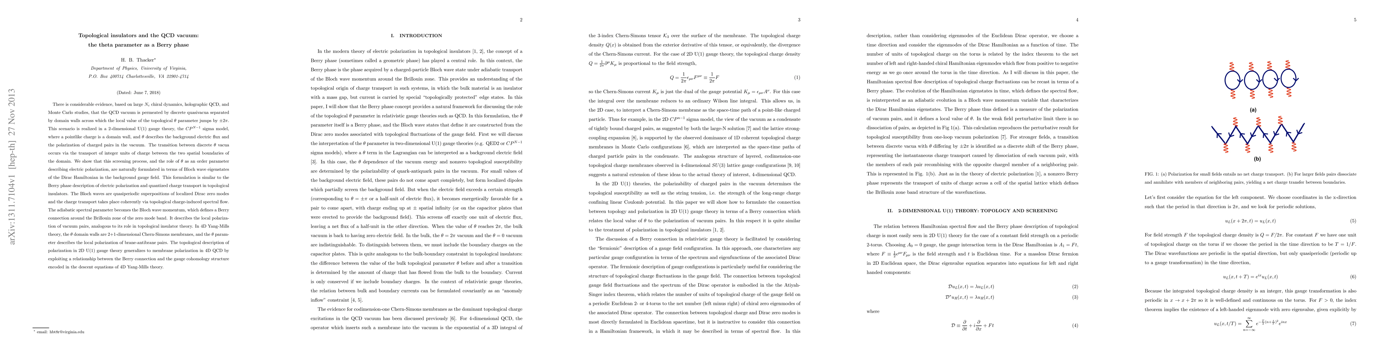 There is considerable evidence, based on large $N_c$ chiral dynamics, holographic QCD, and Monte Carlo studies, that the QCD vacuum is permeated by discrete quasivacua separated by domain walls across which the local value of the topological $\theta$ parameter jumps by $\pm2\pi$. In the 2-dimensional $CP^{N-1}$ sigma model, a pointlike charge is a domain wall, and $\theta$ describes the background electric flux and the polarization of charged pairs in the vacuum. We show that the screening process, and the role of $\theta$ as an order parameter describing electric polarization, are naturally formulated in terms of Bloch wave eigenstates of the Dirac Hamiltonian in the background gauge field. This formulation is similar to the Berry phase description of electric polarization and quantized charge transport in topological insulators. The Bloch waves are quasiperiodic superpositions of localized Dirac zero modes. They define a Berry connection around the Brillouin zone of the zero mode band which describes the local polarization of vacuum pairs, analogous to its role in topological insulator theory. In 4D Yang-Mills theory, the $\theta$ domain walls are 2+1-dimensional Chern-Simons membranes. The interpretation of the $\theta$ parameter as a Berry phase describing the local polarization of brane-antibrane pairs follows from the descent equations of 4D Yang-Mills theory.