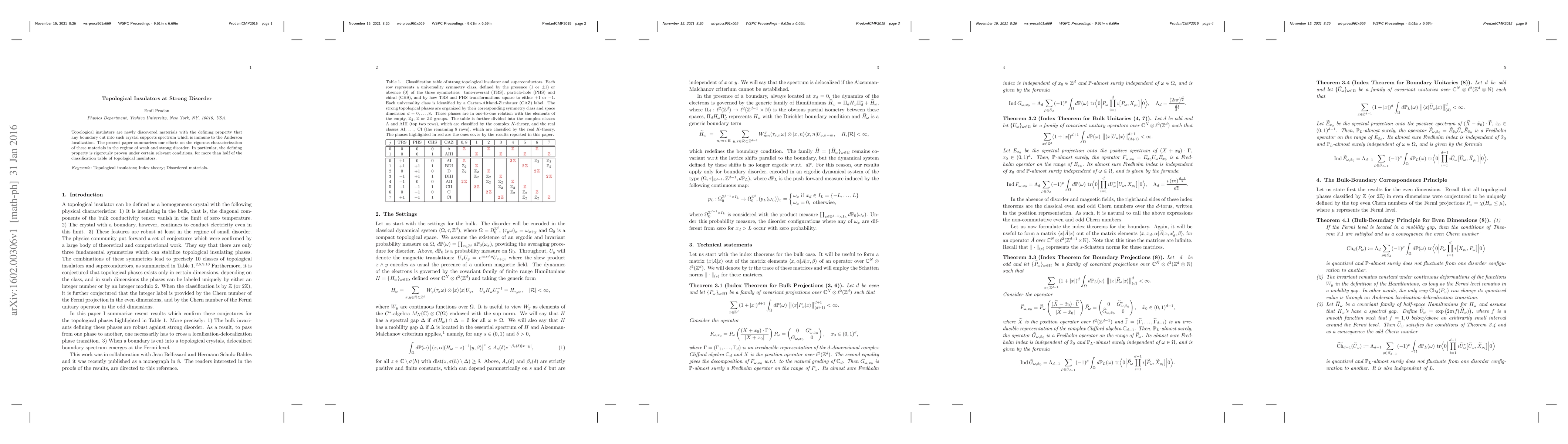 Topological insulators are newly discovered materials with the defining property that any boundary cut into such crystal supports spectrum which is immune to the Anderson localization. The present paper summarizes our efforts on the rigorous characterization of these materials in the regime of weak and strong disorder. In particular, the defining property is rigorously proven under certain relevant conditions, for more than half of the classification table of topological insulators.