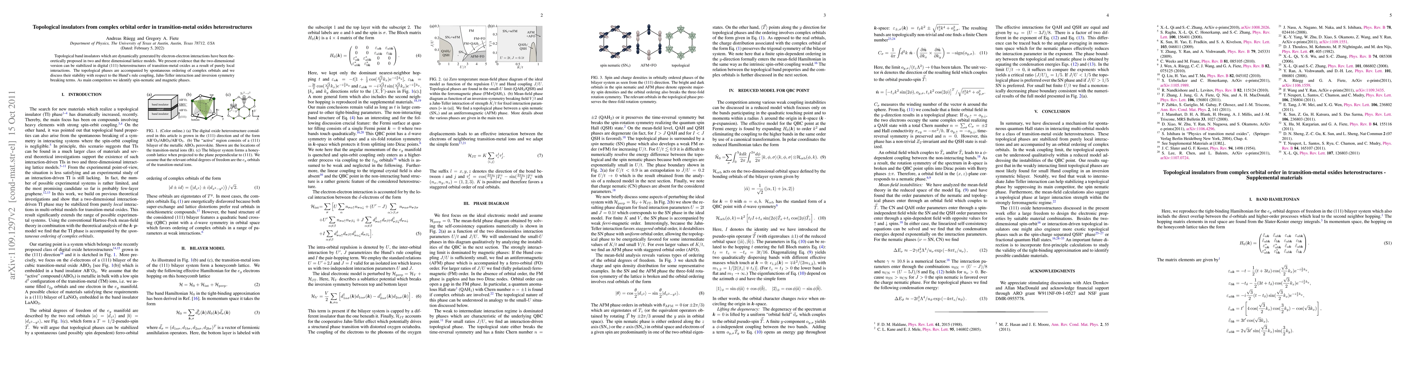 This paper presents evidence for topological band insulators in transition-metal oxide heterostructures, stabilized by local interactions. The topological phases emerge due to spontaneous complex orbital ordering, with stability discussed in relation to various coupling interactions.