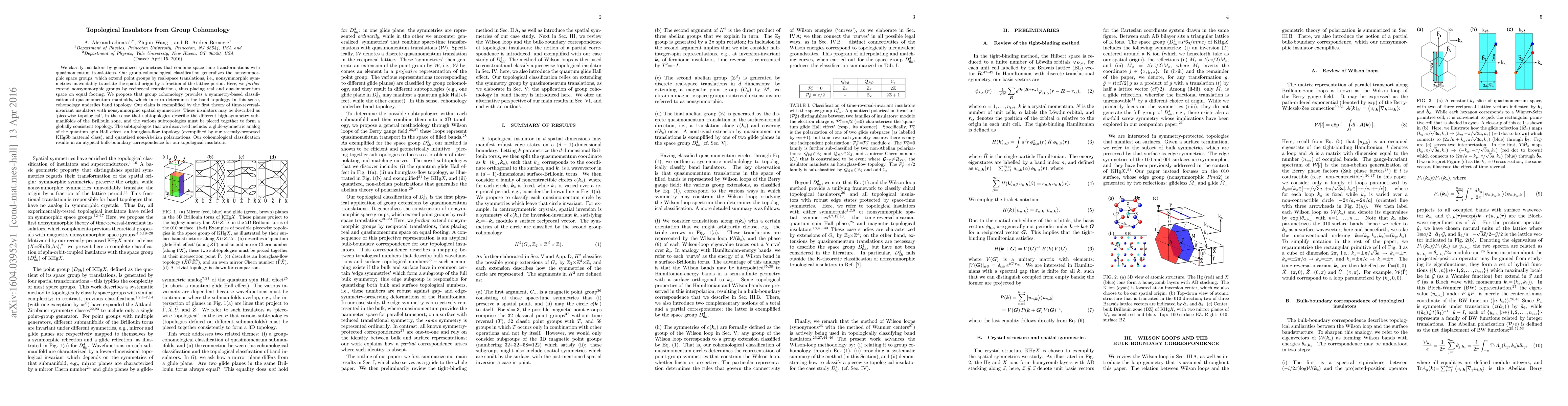 We classify insulators by generalized symmetries that combine space-time transformations with quasimomentum translations. Our group-cohomological classification generalizes the nonsymmorphic space groups, which extend point groups by real-space translations, i.e., nonsymmorphic symmetries unavoidably translate the spatial origin by a fraction of the lattice period. Here, we further extend nonsymmorphic groups by reciprocal translations, thus placing real and quasimomentum space on equal footing. We propose that group cohomology provides a symmetry-based classification of quasimomentum manifolds, which in turn determines the band topology. In this sense, cohomology underlies band topology. Our claim is exemplified by the first theory of time-reversal-invariant insulators with nonsymmorphic spatial symmetries. These insulators may be described as 'piecewise topological', in the sense that subtopologies describe the different high-symmetry submanifolds of the Brillouin zone, and the various subtopologies must be pieced together to form a globally consistent topology. The subtopologies that we discovered include: a glide-symmetric analog of the quantum spin Hall effect, an hourglass-flow topology (exemplified by our recently-proposed KHgSb material class), and quantized non-Abelian polarizations. Our cohomological classification results in an atypical bulk-boundary correspondence for our topological insulators.