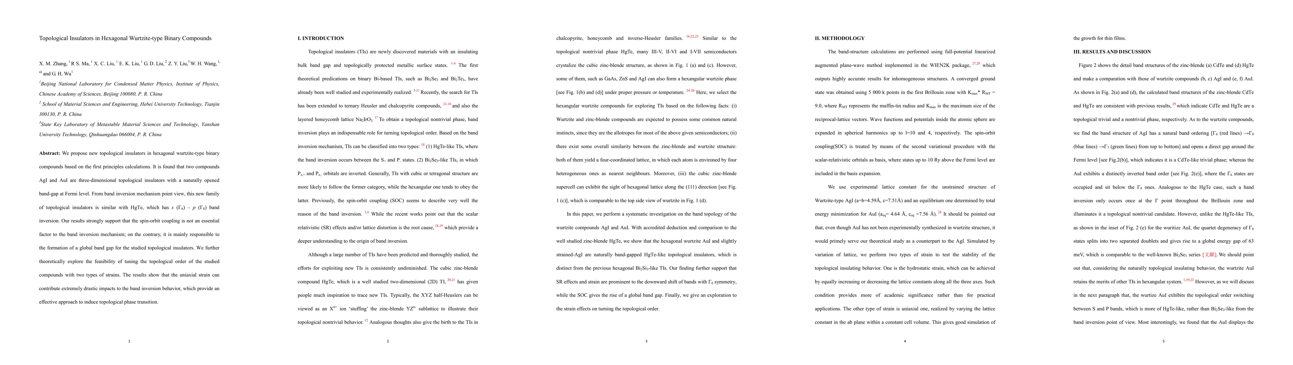 We propose new topological insulators in hexagonal wurtzite-type binary compounds based on the first principles calculations. It is found that two compounds AgI and AuI are three-dimensional topological insulators with a naturally opened band-gap at Fermi level. From band inversion mechanism point view, this new family of topological insulators is similar with HgTe, which has s (Gamma 6) - p (Gamma 8) band inversion. Our results strongly support that the spin-orbit coupling is not an essential factor to the band inversion mechanism; on the contrary, it is mainly responsible to the formation of a global band gap for the studied topological insulators. We further theoretically explore the feasibility of tuning the topological order of the studied compounds with two types of strains. The results show that the uniaxial strain can contribute extremely drastic impacts to the band inversion behavior, which provide an effective approach to induce topological phase transition.