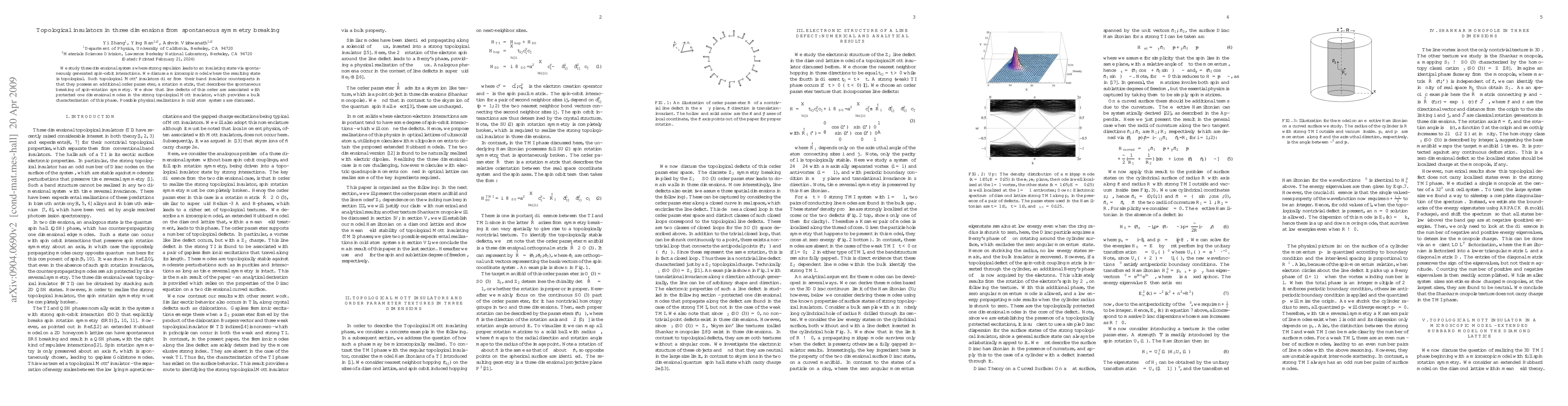 This paper investigates three-dimensional systems where strong repulsion induces a topological insulating state through spontaneously generated spin-orbit interactions. The resulting topological 'Mott' insulators feature an additional order parameter linked to the breaking of spin-rotation symmetry, with line defects hosting protected one-dimensional modes.