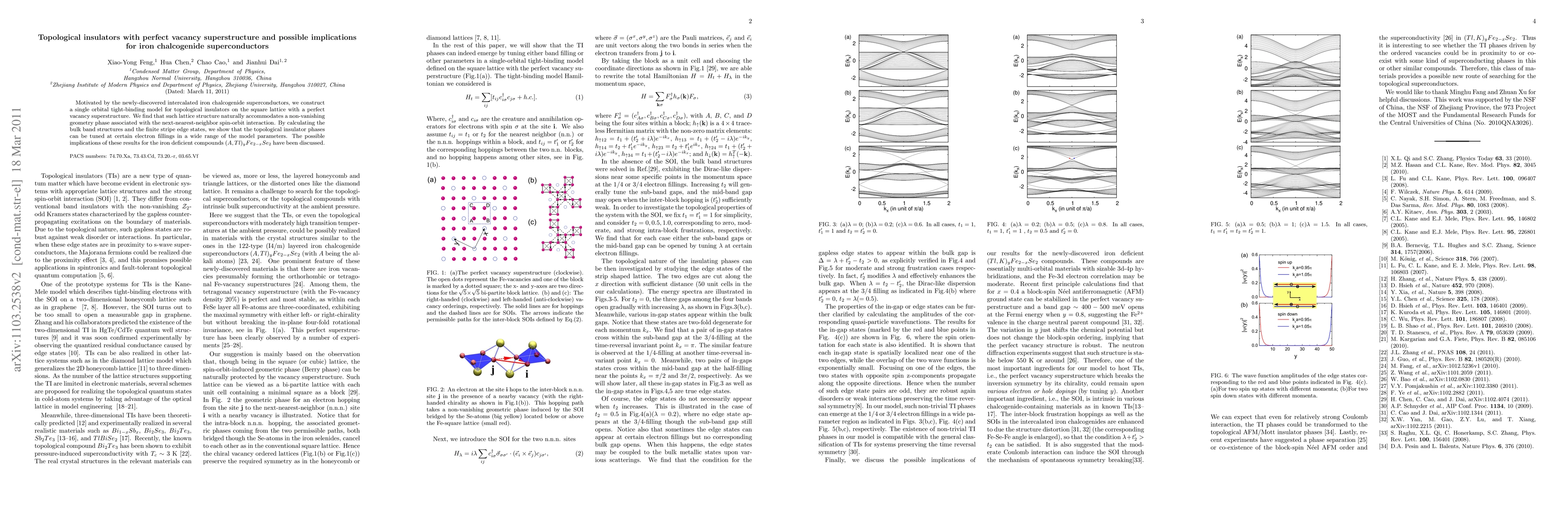 This research develops a tight-binding model for topological insulators on a square lattice with perfect vacancy superstructures, revealing a non-vanishing geometry phase due to next-nearest-neighbor spin-orbit interactions. The findings suggest that topological insulator phases can be tuned across various model parameters, with implications for understanding iron chalcogenide superconductors like $(A,Tl)_{y}Fe_{2-x}Se_2$.