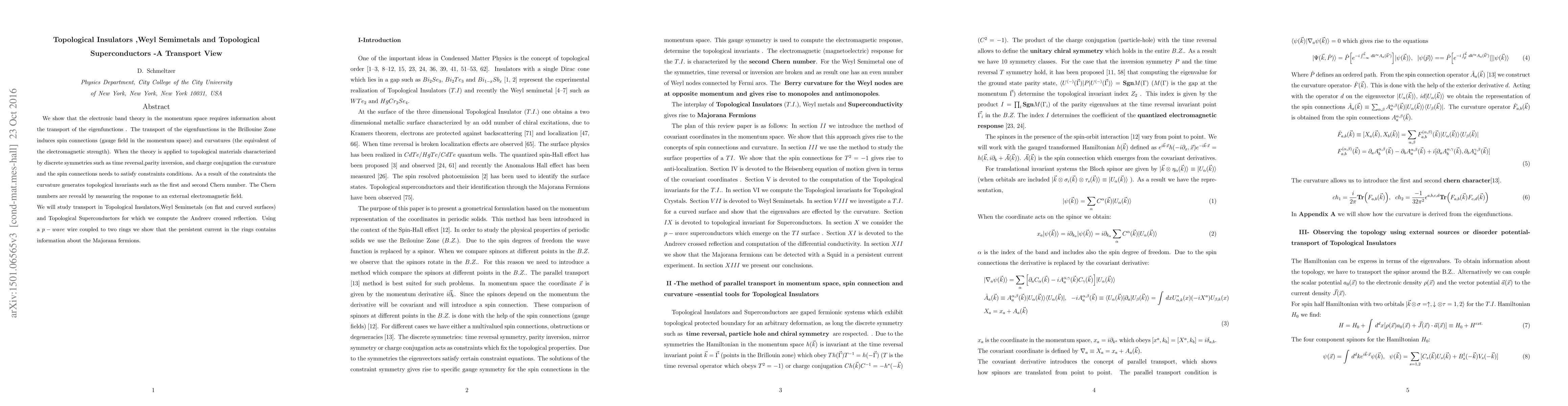 Researchers used a transport-based approach to study topological insulators, Weyl semimetals, and topological superconductors, finding that physical properties depend on topological invariants equivalent to zero modes.