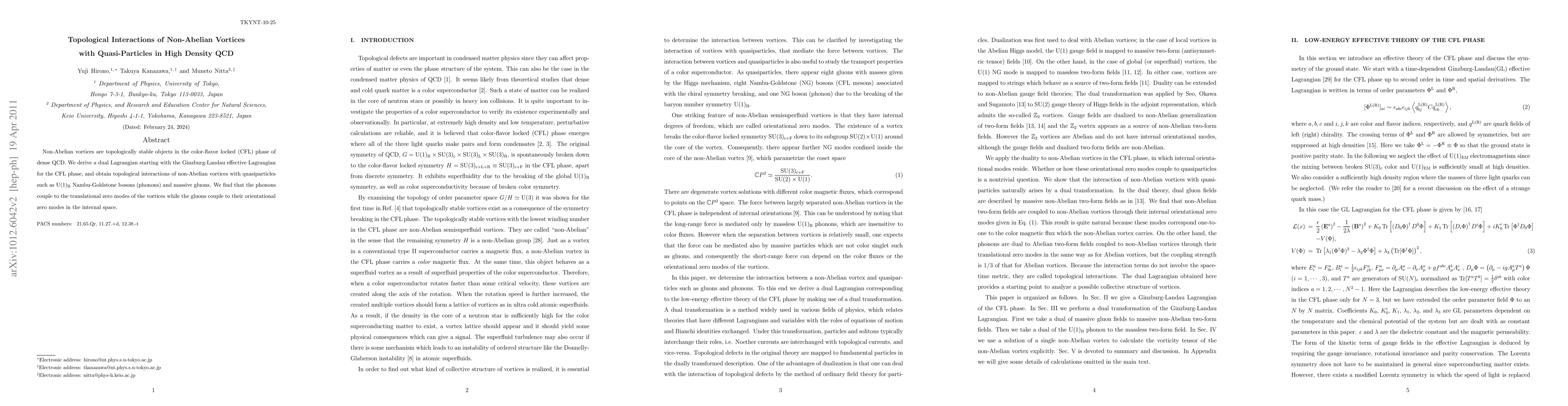 This paper investigates the topological interactions between non-Abelian vortices and quasiparticles in the CFL phase of high-density QCD, deriving a dual Lagrangian from the Ginzburg-Landau effective Lagrangian and identifying how phonons couple to vortex translational zero modes and gluons to their orientational zero modes.