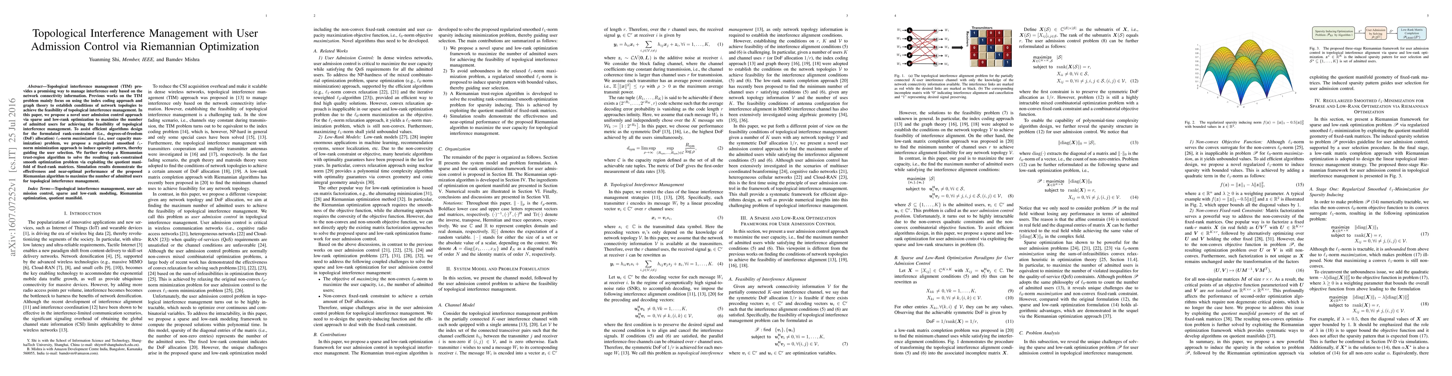 Topological interference management (TIM) provides a promising way to manage interference only based on the network connectivity information. Previous works on the TIM problem mainly focus on using the index coding approach and graph theory to establish conditions of network topologies to achieve the feasibility of topological interference management. In this paper, we propose a novel user admission control approach via sparse and low-rank optimization to maximize the number of admitted users for achieving the feasibility of topological interference management. To assist efficient algorithms design for the formulated rank-constrained (i.e., degrees-of-freedom (DoF) allocation) l0-norm maximization (i.e., user capacity maximization) problem, we propose a regularized smoothed l1- norm minimization approach to induce sparsity pattern, thereby guiding the user selection. We further develop a Riemannian trust-region algorithm to solve the resulting rank-constrained smooth optimization problem via exploiting the quotient manifold of fixed-rank matrices. Simulation results demonstrate the effectiveness and near-optimal performance of the proposed Riemannian algorithm to maximize the number of admitted users for topological interference management.