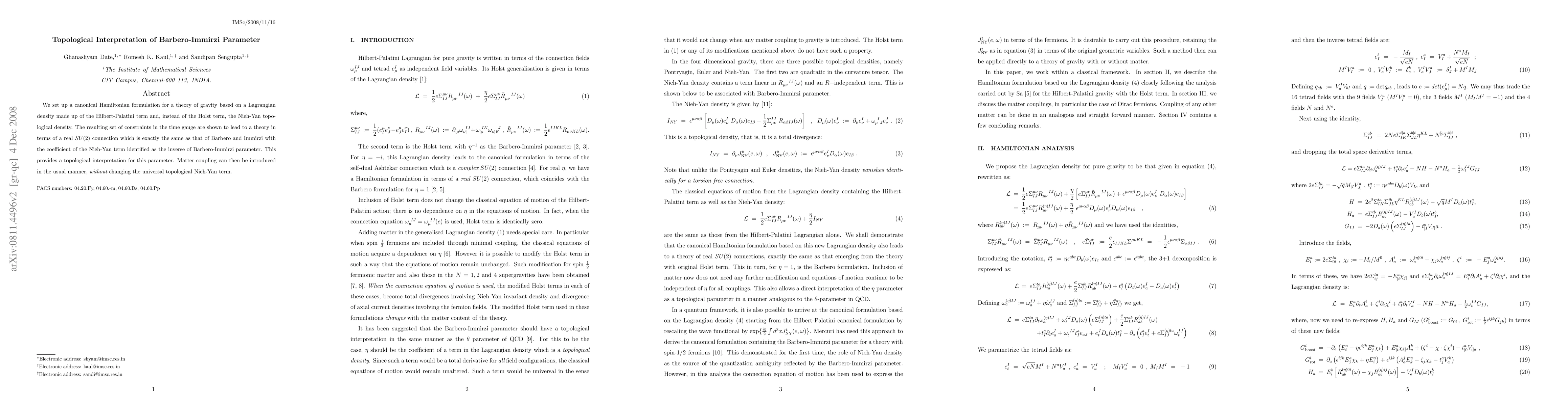 We set up a canonical Hamiltonian formulation for a theory of gravity based on a Lagrangian density made up of the Hilbert-Palatini term and, instead of the Holst term, the Nieh-Yan topological density. The resulting set of constraints in the time gauge are shown to lead to a theory in terms of a real SU(2) connection which is exactly the same as that of Barbero and Immirzi with the coefficient of the Nieh-Yan term identified as the inverse of Barbero-Immirzi parameter. This provides a topological interpretation for this parameter. Matter coupling can then be introduced in the usual manner, {\em without} changing the universal topological Nieh-Yan term.