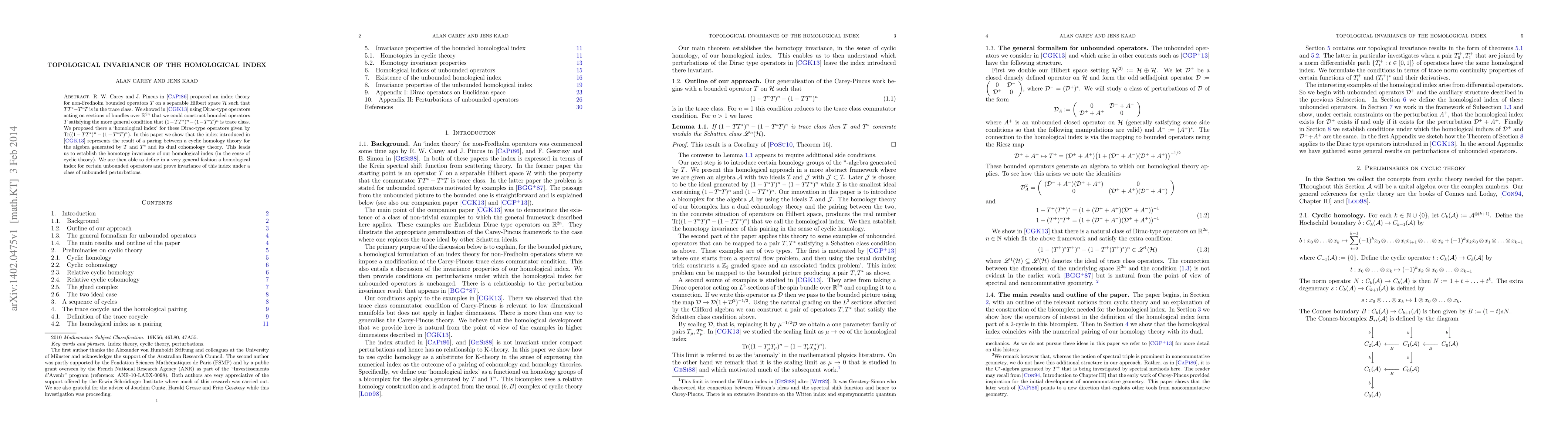 R. W. Carey and J. Pincus in [CaPi86] proposed and index theory for non-Fredholm bounded operators T on a separable Hilbert space H such that TT* - T*T is in the trace class. We showed in [CGK13] using Dirac-type operators acting on sections of bundles over R^{2n} that we could construct bounded operators T satisfying the more general condition that (1-TT*)^n - (1-T*T)^n is trace class. We proposed there a "homological" index for these Dirac-type operators given by Tr( (1-TT*)^n - (1-T*T)^n ). In this paper we show that the index introduced in [CGK13] represents the result of a pairing between a cyclic homology theory for the algebra generated by T and T* and its dual cohomology theory. This leads us to establish homotopy invariance of our homological index (in the sense of cyclic theory). We are then able to define in a very general fashion a homological index for certain unbounded operators and prove invariance of this index under a class of unbounded perturbations.