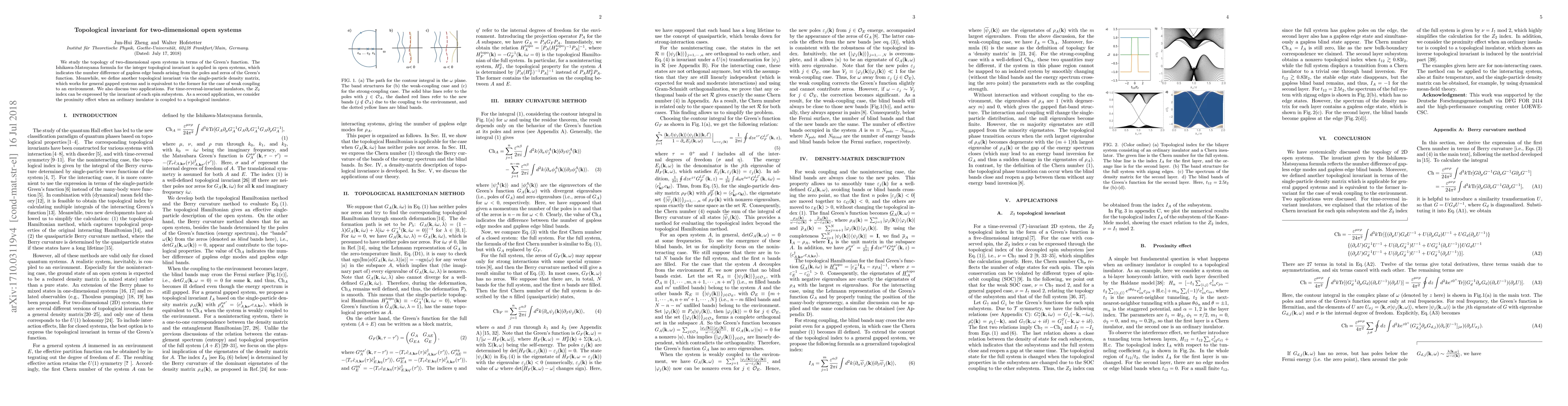 We study the topology of two-dimensional open systems in terms of the Green's function. The Ishikawa-Matsuyama formula for the integer topological invariant is applied in open systems, which indicates the number difference of gapless edge bands arising from the poles and zeros of the Green's function. Meanwhile, we define another topological invariant via the single-particle density matrix, which works for general gapped systems and is equivalent to the former for the case of weak coupling to an environment. We also discuss two applications. For time-reversal-invariant insulators, the ${Z}_{2}$ index can be expressed by the invariant of each spin subsystem. As a second application, we consider the proximity effect when an ordinary insulator is coupled to a topological insulator.