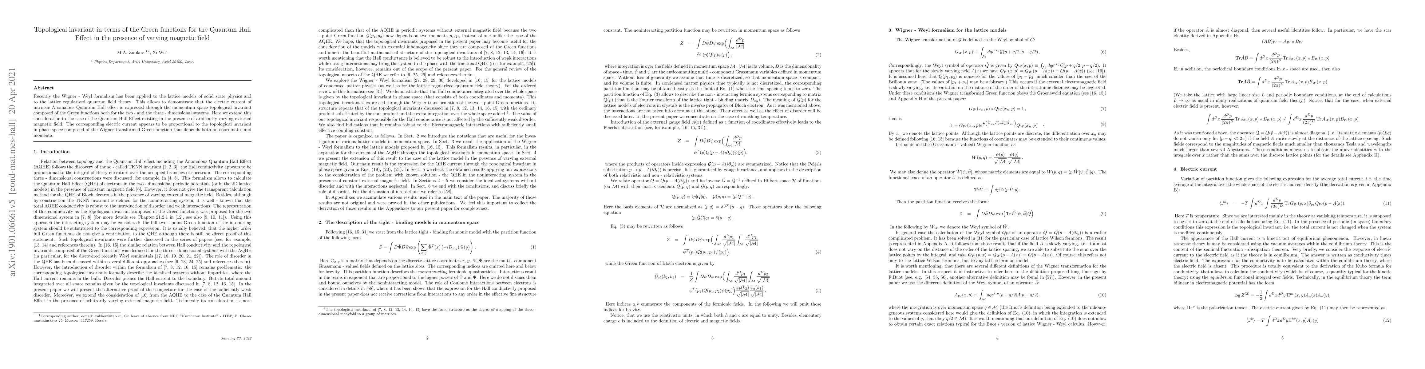 Recently the Wigner - Weyl formalism has been applied to the lattice models of solid state physics and to the lattice regularized quantum field theory. This allows to demonstrate that the electric current of intrinsic Anomalous Quantum Hall effect is expressed through the momentum space topological invariant composed of the Green functions both for the two - and the three - dimensional systems. Here we extend this consideration to the case of the Quantum Hall Effect existing in the presence of arbitrarily varying external magnetic field. The corresponding electric current appears to be proportional to the topological invariant in phase space composed of the Wigner transformed Green function that depends both on coordinates and momenta.