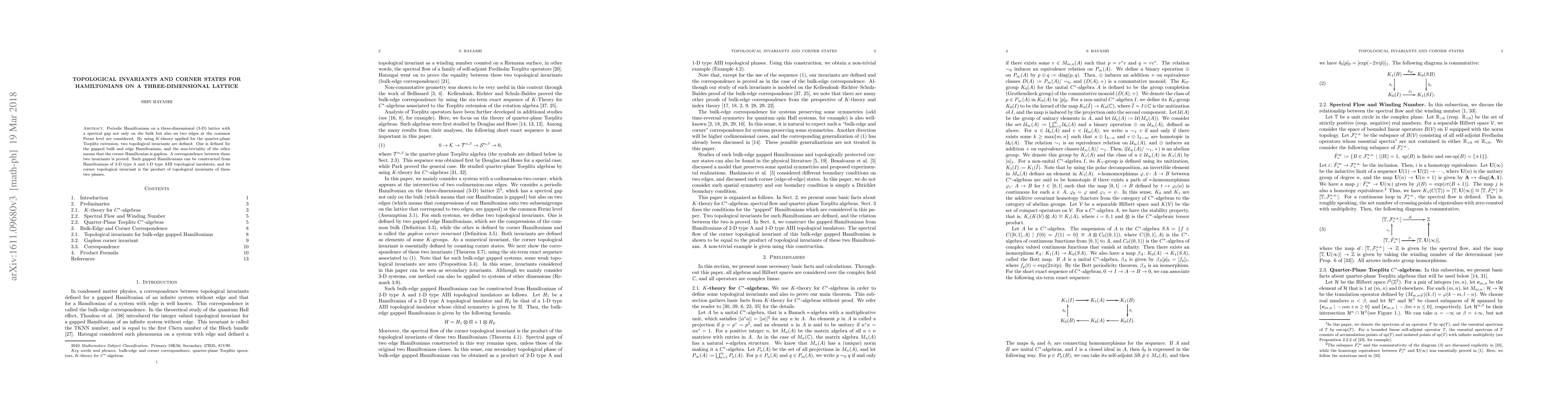 This paper explores Hamiltonians on a 3-D lattice with spectral gaps on the bulk and edges, defining topological invariants using K-theory and proving a correspondence between them. The invariants indicate whether the corner states are gapless, and the corner's topological invariant is derived from the product of invariants from 2-D and 1-D topological insulators.