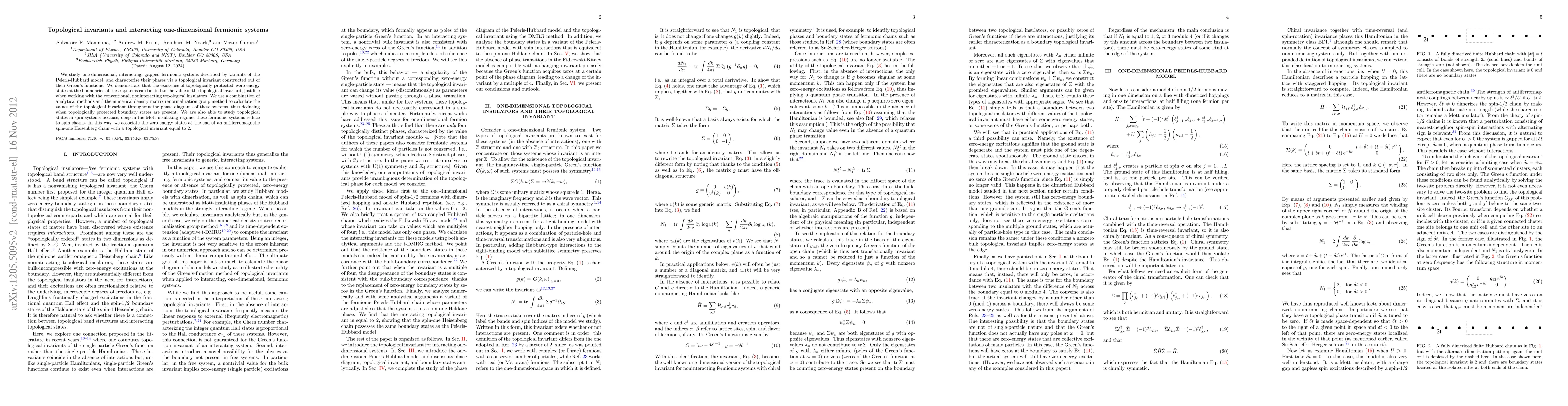 This paper investigates topological invariants in one-dimensional, interacting fermionic systems modeled by variants of the Peierls-Hubbard model, demonstrating that topologically protected boundary states correlate with the values of these invariants, similar to noninteracting topological insulators. The study combines analytical and numerical methods to identify topological phases and zero-energy states in spin systems, particularly in the Mott insulating regime.