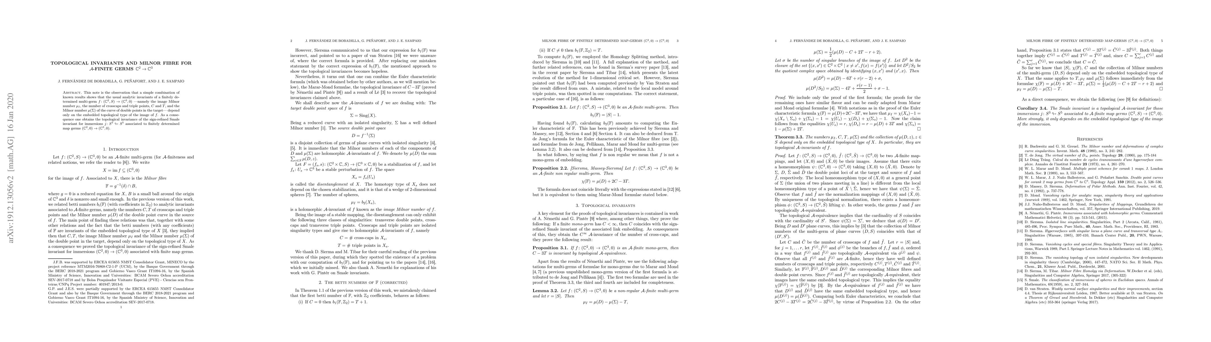 This note is the observation that a simple combination of known results shows that the usual analytic invariants of a finitely determined multi-germ $f\colon (\mathbb{C}^2,S)\to(\mathbb{C}^3,0)$ ---namely the image Milnor number $\mu_I$, the number of crosscaps and triple points, $C$ and $T$, and the Milnor number $\mu(\Sigma)$ of the curve of double points in the target--- depend only on the embedded topological type of the image of $f$. As a consequence one obtains the topological invariance of the sign-refined Smale invariant for immersions $j\colon S^3\looparrowright S^5$ associated to finitely determined map germs $(\mathbb{C}^2,0)\to(\mathbb{C}^3,0)$. This note is a corrected version of a previous homonymous work containing an error. A previous wrong computation of $b_1(\mathbb{F})$, spotted by Siersma, has been replaced by the correct statement, due to Van Straten. This has forced the proofs for the mentioned topological invariances to differ significantly from the previous version.
