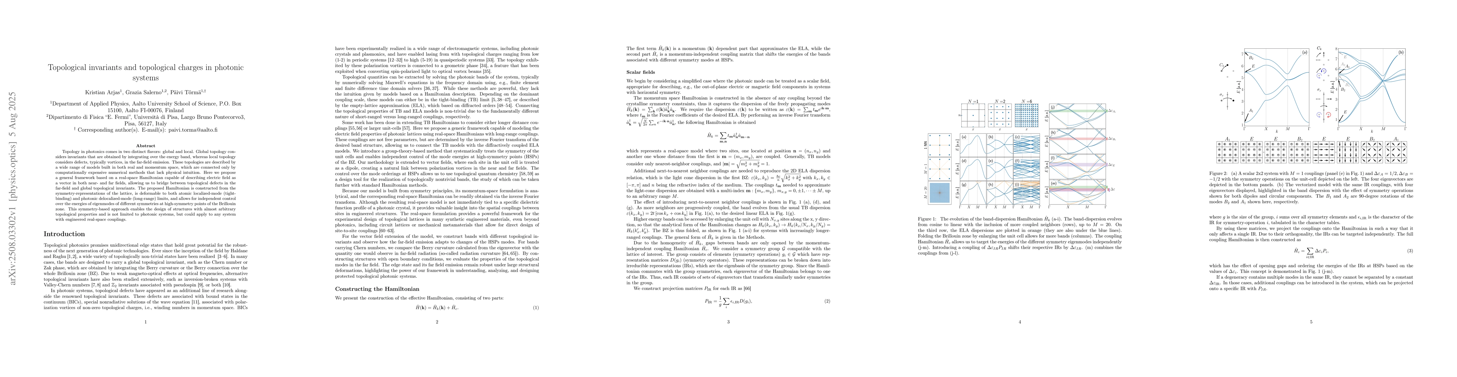 Topology in photonics comes in two distinct flavors: global and local. Global topology considers invariants that are obtained by integrating over the energy band, whereas local topology considers defects, typically vortices, in the far-field emission. These topologies are described by a wide range of models built in both real and momentum space, which are connected only by computationally expensive numerical methods that lack physical intuition. Here we propose a general framework based on a real-space Hamiltonian capable of describing electric field as a vector in both near- and far fields, allowing us to bridge between topological defects in the far-field and global topological invariants. The proposed Hamiltonian is constructed from the symmetry-representations of the lattice, is deformable to both atomic localized-mode (tight-binding) and photonic delocalized-mode (long-range) limits, and allows for independent control over the energies of eigenmodes of different symmetries at high-symmetry points of the Brillouin zone. This symmetry-based approach enables the design of structures with almost arbitrary topological properties and is not limited to photonic systems, but could apply to any system with engineered real-space couplings.