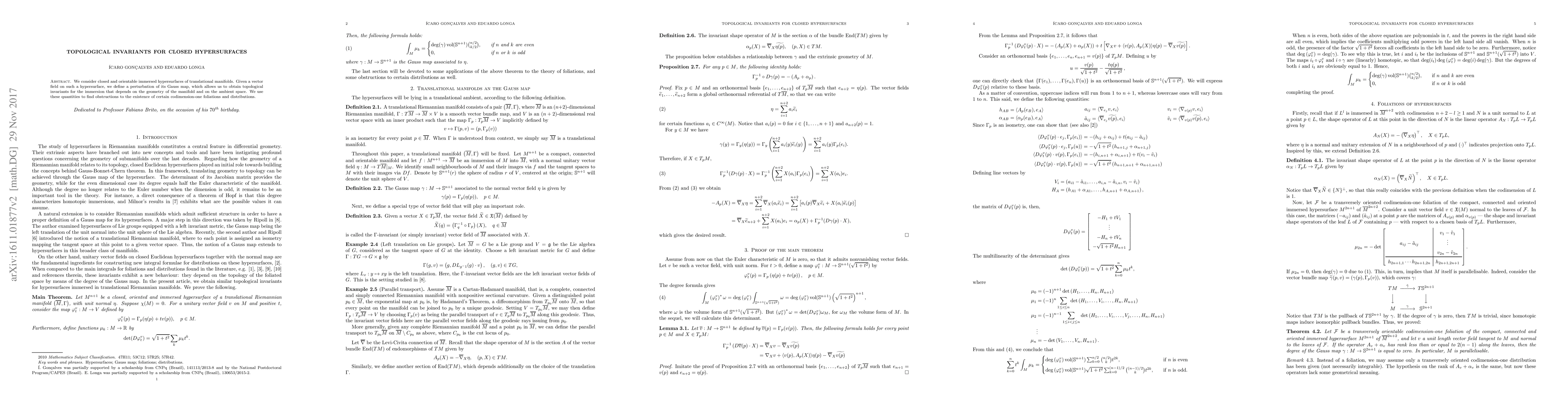 We consider closed and orientable immersed hypersurfaces of translational manifolds. Given a vector field on such a hypersurface, we define a perturbation of its Gauss map, which allows us to obtain topological invariants for the immersion that depends on the geometry of the manifold and the ambient space. We use these quantities to find obstructions to the existence of certain codimension one foliations.