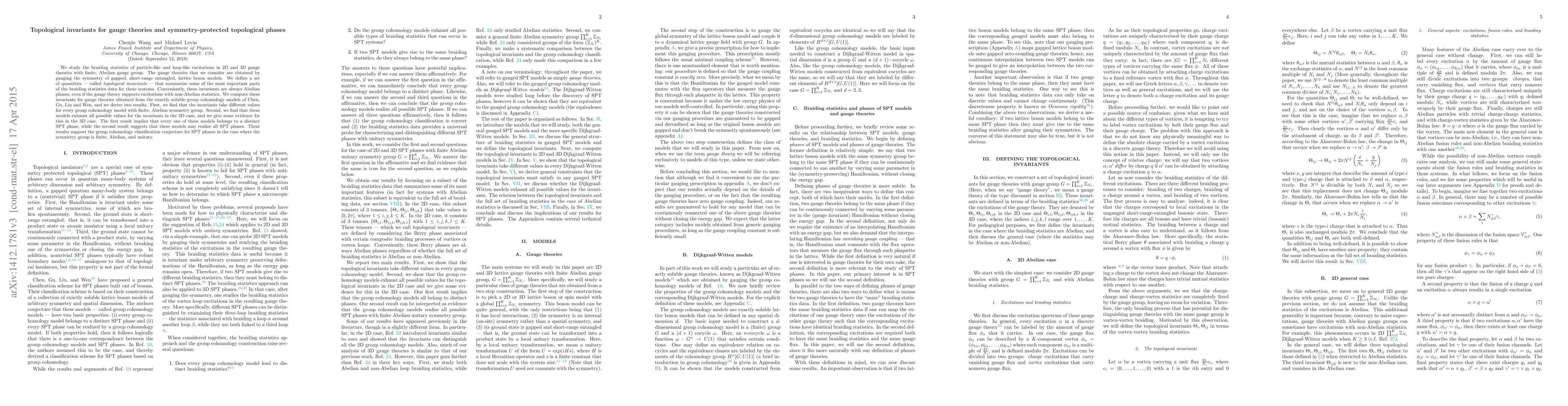 This paper investigates topological invariants in 2D and 3D gauge theories, derived from lattice boson models, which summarize braiding statistics. The study finds that different group cohomology models yield distinct invariants, supporting the classification conjecture for symmetry-protected topological phases.