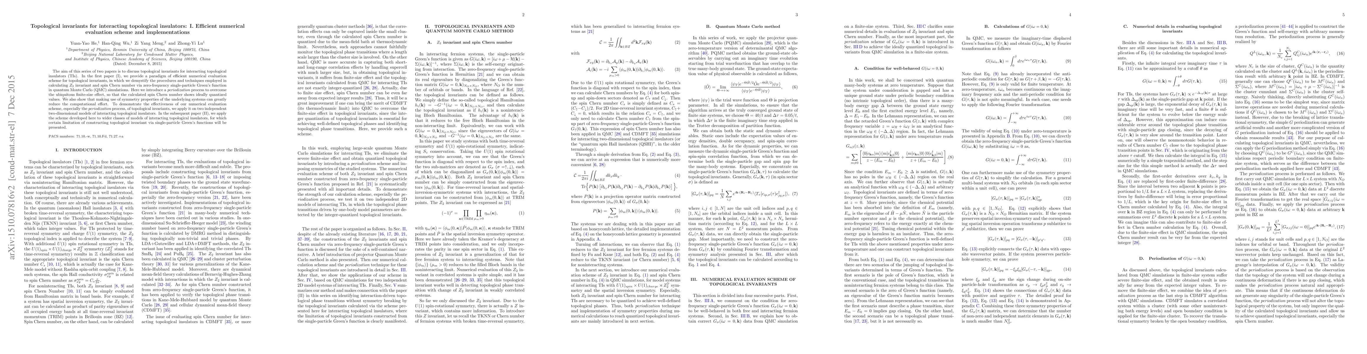 The aim of this series of two papers is to discuss topological invariants for interacting topological insulators (TIs). In the first paper (I), we provide a paradigm of efficient numerical evaluation scheme for topological invariants, in which we demystify the procedures and techniques employed in calculating Z2 invariant and spin Chern number via zero-frequency single-particle Green's function in quantum Monte Carlo (QMC) simulations. Here we introduce a periodization process to overcome the ubiquitous finite-size effect, so that the calculated spin Chern number shows ideally quantized values. We also show that making use of symmetry properties of the underlying systems can greatly reduce the computational effort. To demonstrate the effectiveness of our numerical evaluation scheme, especially the periodization process, of topological invariants, we apply it on two independent two-dimensional models of interacting topological insulators. In the subsequent paper (II), we apply the scheme developed here to wider classes of models of interacting topological insulators, for which certain limitation of constructing topological invariant via single-particle Green's functions will be presented.
