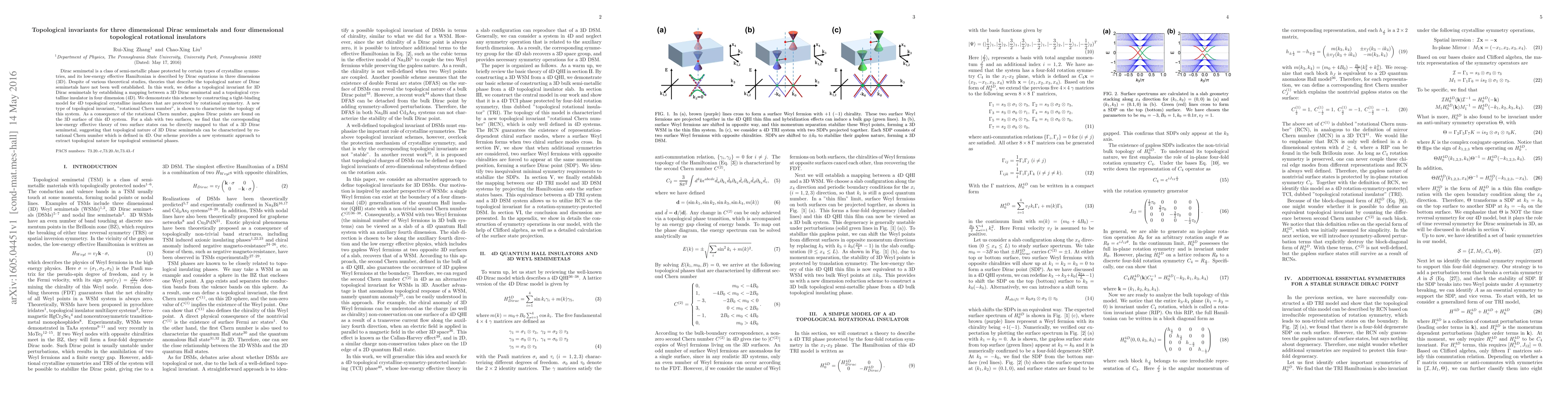 This paper introduces a topological invariant, the "rotational Chern number," for three-dimensional Dirac semimetals by establishing a connection with four-dimensional topological crystalline insulators. It demonstrates this through a tight-binding model and shows that the invariant characterizes the topological nature of the semimetals.