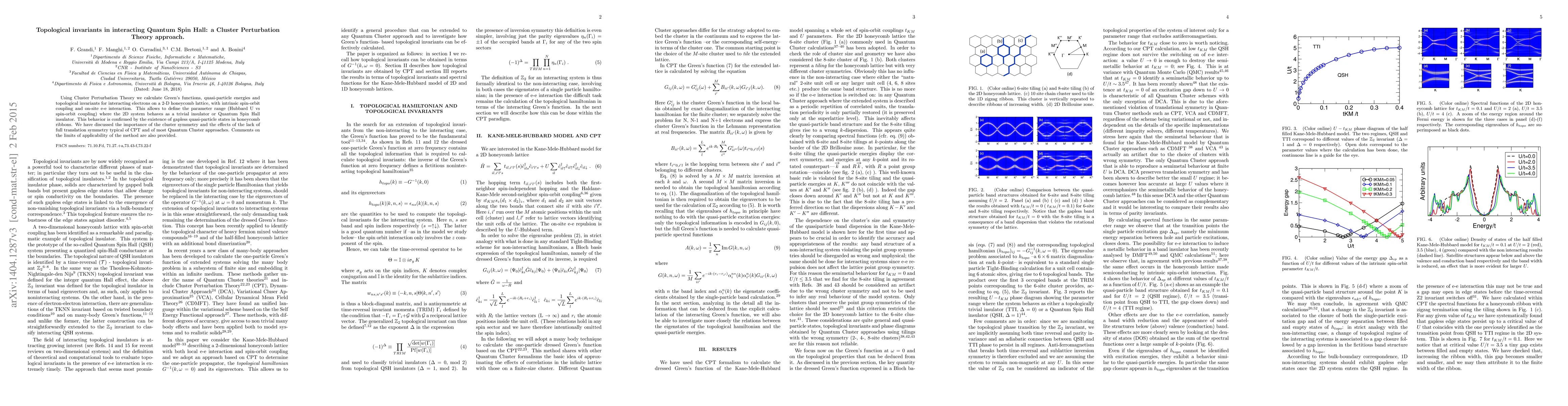 Using Cluster Perturbation Theory we calculate Green's functions, quasi-particle energies and topological invariants for interacting electrons on a 2-D honeycomb lattice, with intrinsic spin-orbit coupling and on-site e-e interaction. This allows to define the parameter range (Hubbard U vs spin-orbit coupling) where the 2D system behaves as a trivial insulator or Quantum Spin Hall insulator. This behavior is confirmed by the existence of gapless quasi-particle states in honeycomb ribbons. We have discussed the importance of the cluster symmetry and the effects of the lack of full translation symmetry typical of CPT and of most Quantum Cluster approaches. Comments on the limits of applicability of the method are also provided.