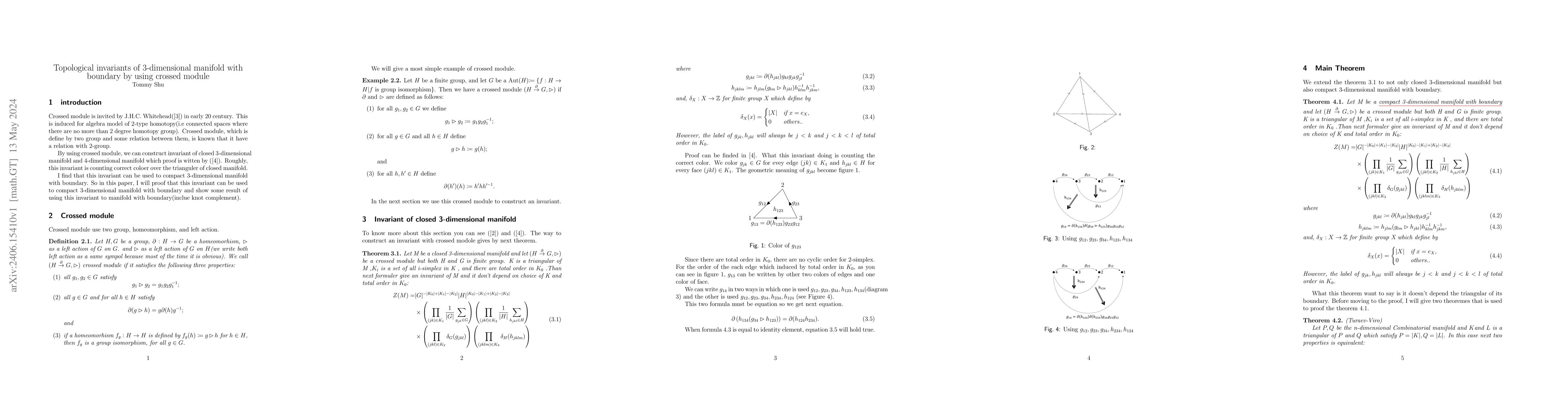 J.H.C. Whitehead introduced the concept of crossed modules in the early 20th century. These crossed modules are crucial for algebraic models of 2-type homotopy, which involve connected spaces with no higher than second-degree homotopy groups. They consist of two groups and certain relations between them, with known connections to 2-groups. By employing crossed modules, we can develop invariants for closed 3-dimensional and 4-dimensional manifolds. The validity of these invariants was established in a paper authored by F.Girelli, H.Pfeiffer, and E.M.Popescu([4]). Essentially, these invariants involve counting correct colors over the triangulation of a closed manifold. Interestingly, I've discovered that these invariants can also be applied to compact 3-dimensional manifolds with boundaries. Therefore, in this paper, I intend to demonstrate how these invariants can be utilized for compact 3-dimensional manifolds with boundaries, including the complements of knots.
