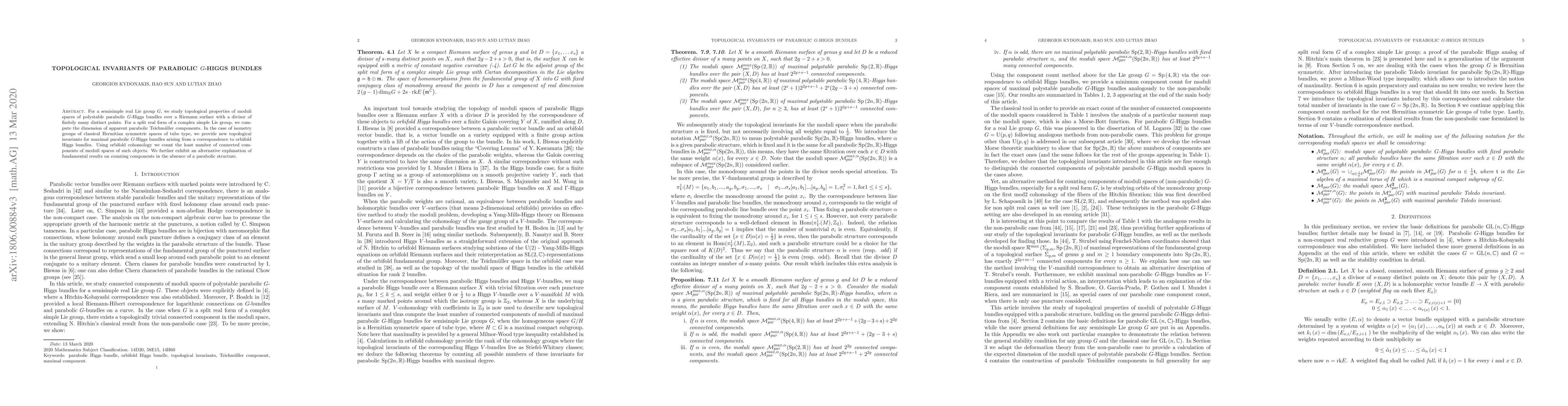 This paper investigates topological properties of moduli spaces of parabolic $G$-Higgs bundles over Riemann surfaces, computes dimensions for apparent parabolic Teichmüller components, and introduces new topological invariants for maximal parabolic $G$-Higgs bundles via a correspondence to orbifold Higgs bundles, employing orbifold cohomology to count moduli space components.