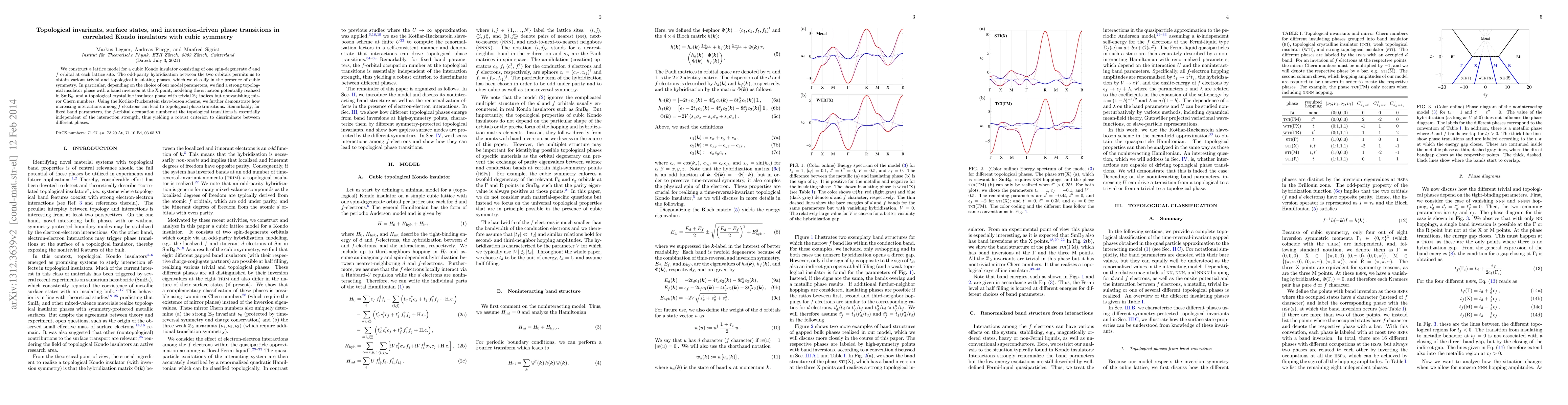 We construct a lattice model for a cubic Kondo insulator consisting of one spin-degenerate $d$ and $f$ orbital at each lattice site. The odd-parity hybridization between the two orbitals permits us to obtain various trivial and topological insulating phases, which we classify in the presence of cubic symmetry. In particular, depending on the choice of our model parameters, we find a strong topological insulator phase with a band inversion at the $\mathrm{X}$ point, modeling the situation potentially realized in SmB$_6$, and a topological crystalline insulator phase with trivial $\mathbb{Z}_2$ indices but nonvanishing mirror Chern numbers. Using the Kotliar-Ruckenstein slave-boson scheme, we further demonstrate how increasing interactions among $f$ electrons can lead to topological phase transitions. Remarkably, for fixed band parameters, the $f$-orbital occupation number at the topological transitions is essentially independent of the interaction strength, thus yielding a robust criterion to discriminate between different phases.