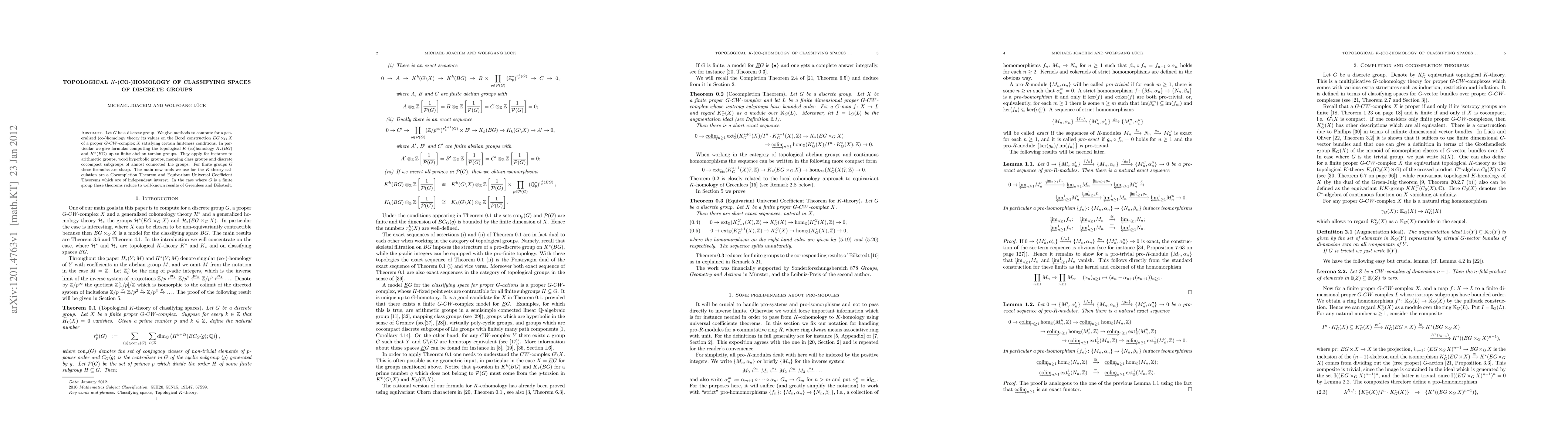Let G be a discrete group. We give methods to compute for a generalized (co-)homology theory its values on the Borel construction (EG x X)/G of a proper G-CW-complex X satisfying certain finiteness conditions. In particular we give formulas computing the topological K-(co)homology of the classifying space BG up to finite abelian torsion groups. They apply for instance to arithmetic groups, word hyperbolic groups, mapping class groups and discrete cocompact subgroups of almost connected Lie groups. For finite groups G these formulas are sharp. The main new tools we use for the K-theory calculation are a Cocompletion Theorem and Equivariant Universal Coefficient Theorems which are of independent interest. In the case where G is a finite group these theorems reduce to well-known results of Greenlees and Boekstedt.