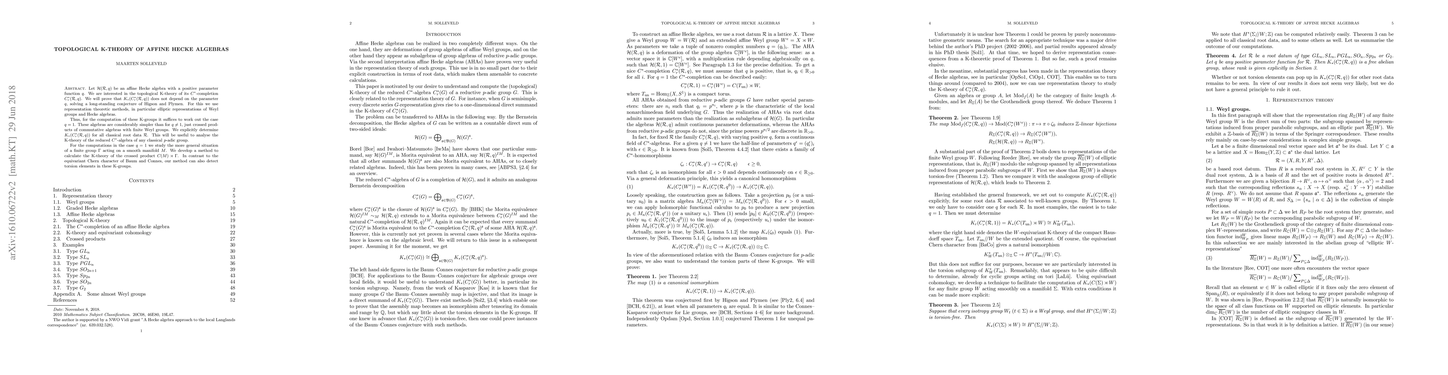 This paper investigates the topological K-theory of affine Hecke algebras, demonstrating that the K-theory of their C*-completions does not depend on the parameter q. It utilizes representation theory, specifically elliptic representations, to simplify computations and determine $K_* (C*_r (R,q))$ for various root data.
