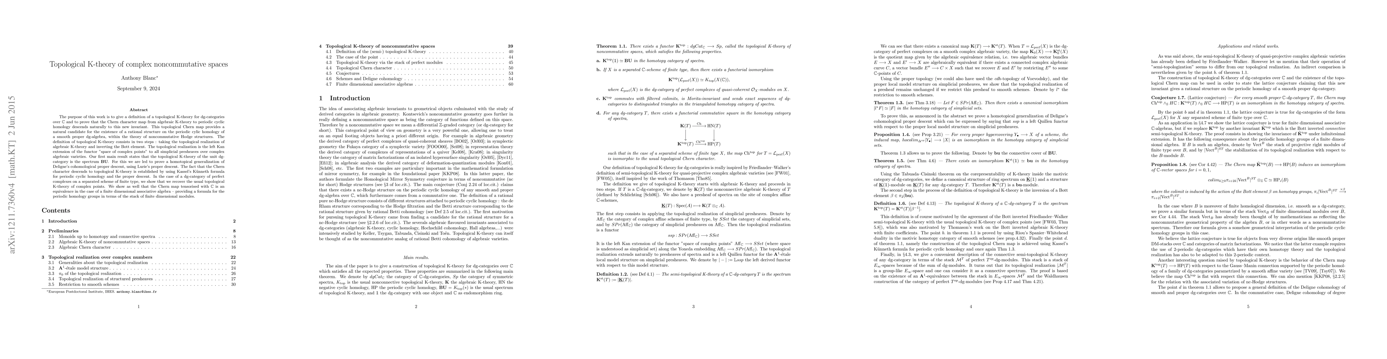 This paper defines topological K-theory for dg-categories over C and proves that the Chern character map descends to this new invariant, suggesting a rational structure in noncommutative Hodge theory. The main results include showing that the topological K-theory of the unit dg-category is the spectrum BU and that the Chern character map descends via proper descent and Kassel's K\"unneth formula.