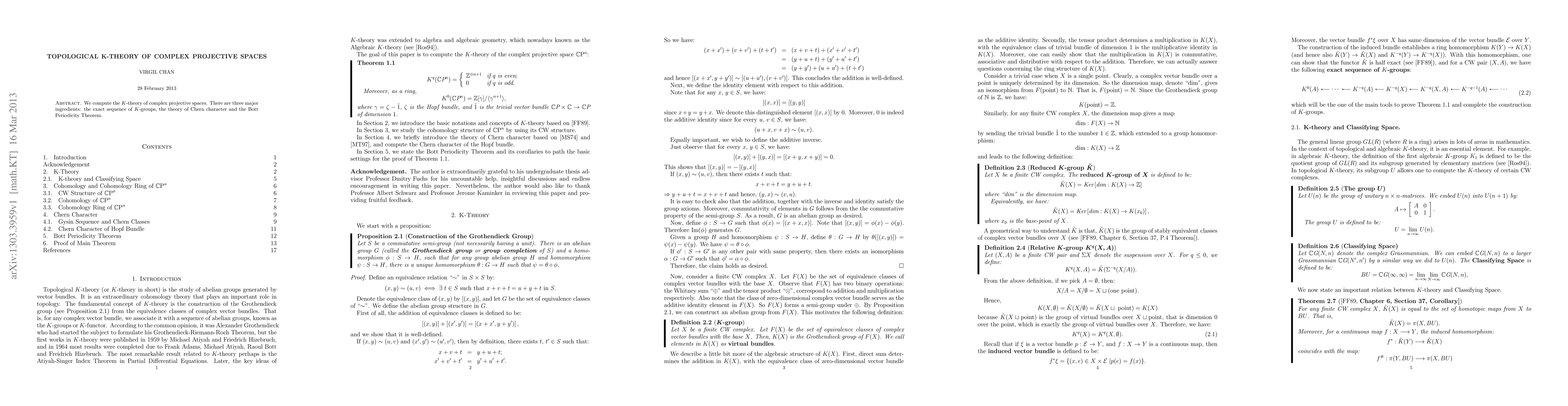 Two-Line Summary: This paper computes the K-theory of complex projective spaces using the exact sequence of K-groups, the Chern character, and the Bott Periodicity Theorem. The results elucidate the intricate structure of these spaces within the framework of topological K-theory.