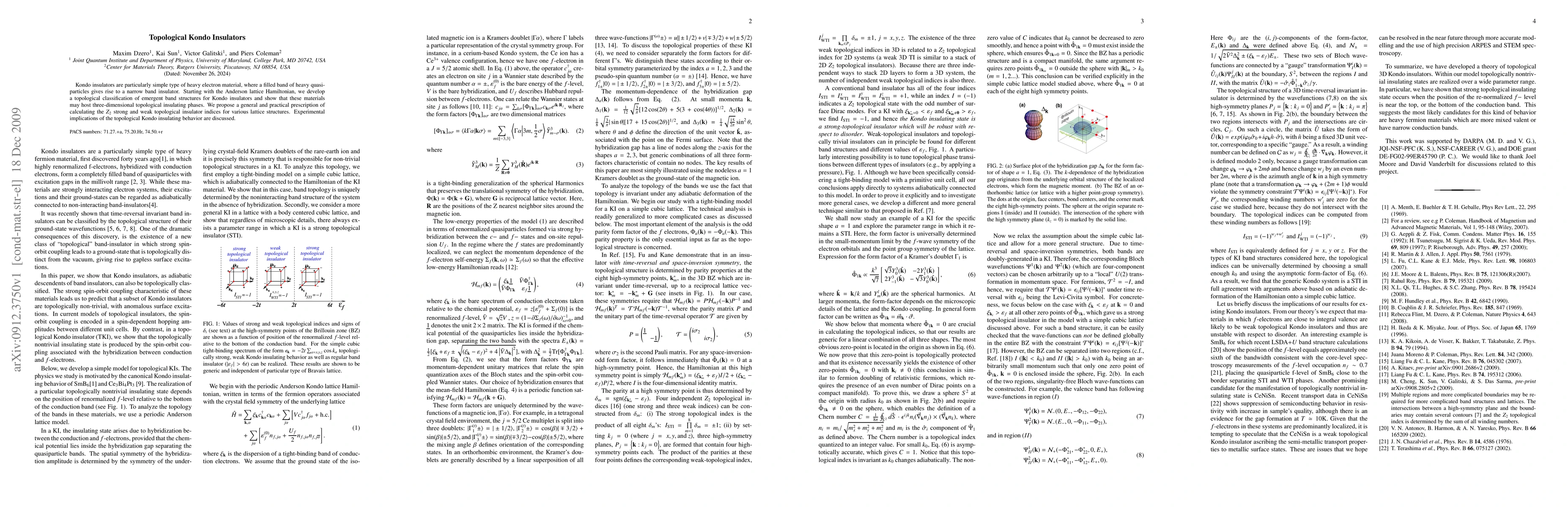Kondo insulators are particularly simple type of heavy electron material, where a filled band of heavy quasiparticles gives rise to a narrow band insulator. Starting with the Anderson lattice Hamiltonian, we develop a topological classification of emergent band structures for Kondo insulators and show that these materials may host three-dimensional topological insulating phases. We propose a general and practical prescription of calculating the Z_2 strong and weak topological insulator indices for various lattice structures. Experimental implications of the topological Kondo insulating behavior are discussed.