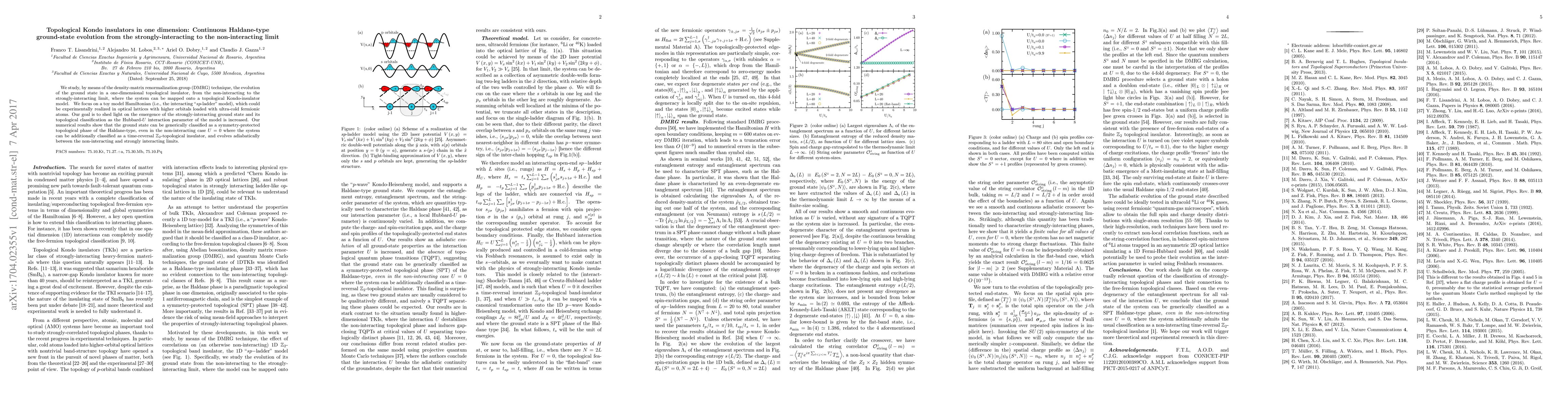 This paper uses DMRG to study the evolution of a one-dimensional topological insulator's ground state, transitioning from non-interacting to strongly-interacting conditions, revealing a continuous Haldane-type topological phase. The findings show an adiabatic evolution between limits, maintaining a $\mathbb{Z}_{2}$-topological classification.