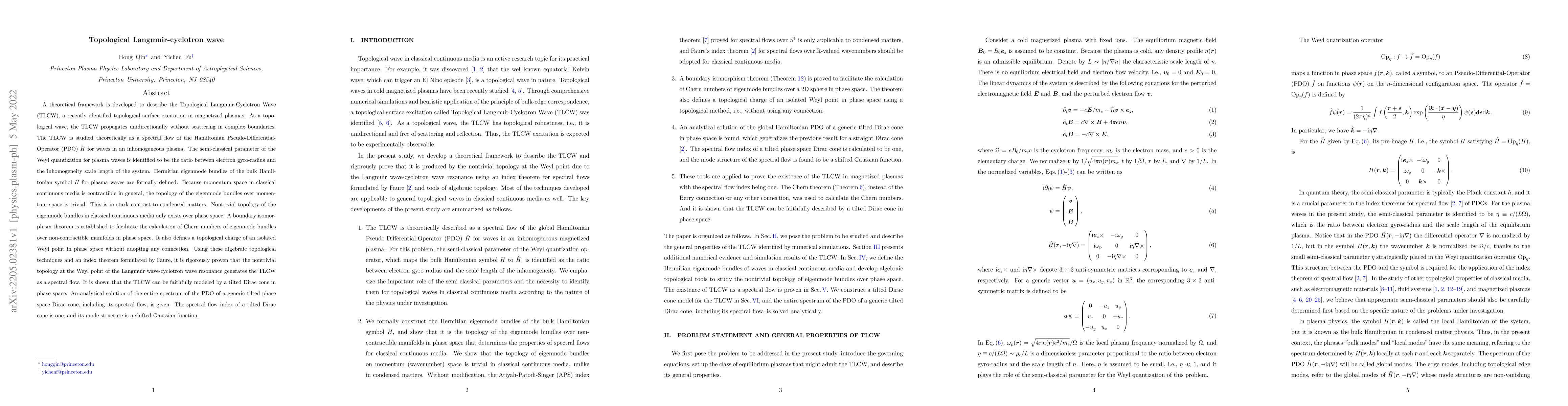 This paper develops a theoretical framework to describe the Topological Langmuir-Cyclotron Wave (TLCW), a unidirectional topological wave in magnetized plasmas. It establishes a boundary isomorphism theorem to calculate Chern numbers and proves the nontrivial topology of eigenmode bundles over phase space generates the TLCW, modeled by a tilted Dirac cone with a spectral flow index of one.