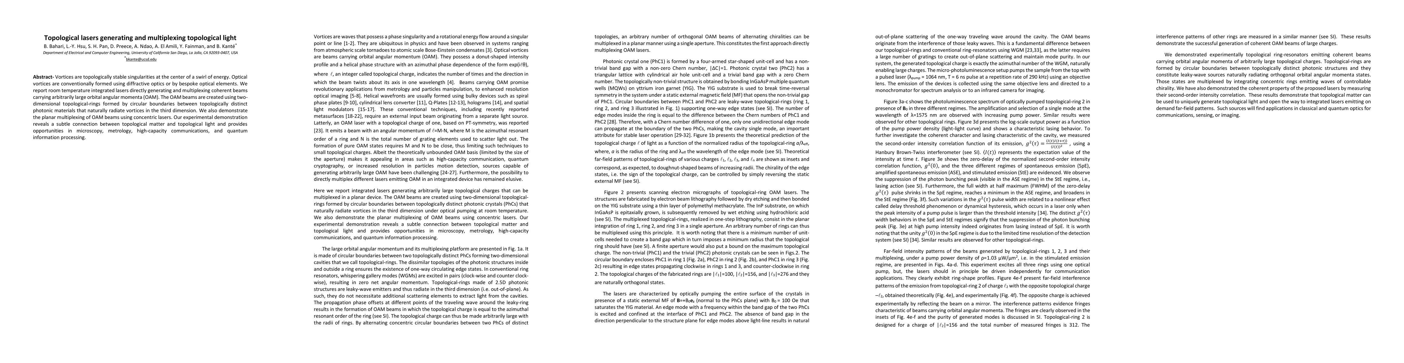 This paper reports the development of integrated room-temperature lasers that generate and multiplex coherent beams with large orbital angular momenta using topological-rings of photonic materials. The study highlights the potential applications in advanced fields like microscopy, high-capacity communications, and quantum information processing.