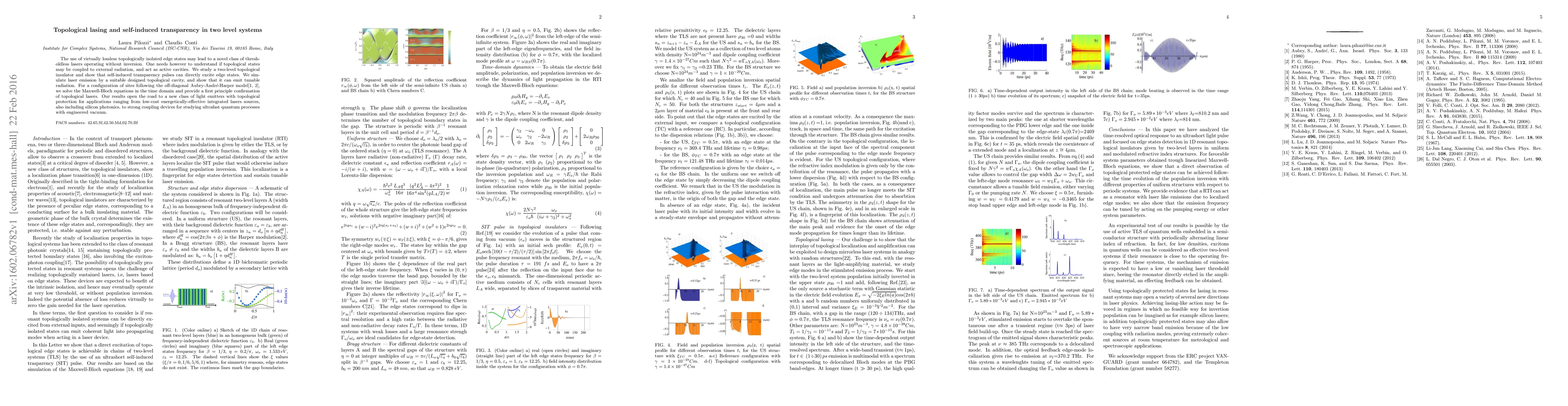This paper explores the potential of topologically isolated edge states in two-level systems to create thresholdless lasers without inversion. It demonstrates that self-induced transparency pulses can excite these edge states, leading to tunable laser emission in a topological cavity, confirmed through solving the Maxwell-Bloch equations and suggesting applications in low-cost, efficient light sources and quantum processes.