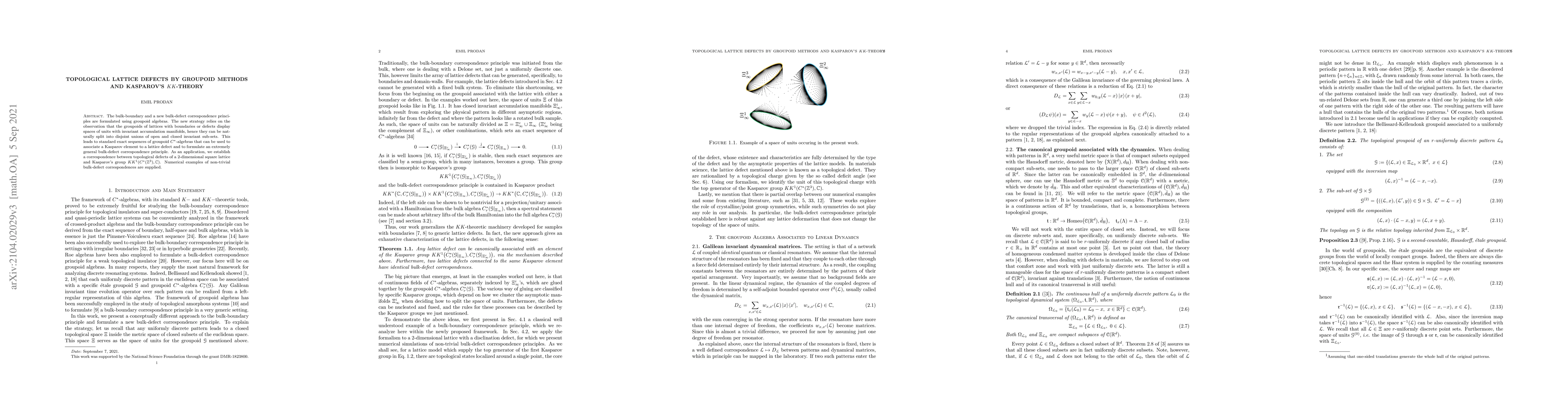 The bulk-boundary and a new bulk-defect correspondence principles are formulated using groupoid algebras. The new strategy relies on the observation that the groupoids of lattices with boundaries or defects display spaces of units with invariant accumulation manifolds, hence they can be naturally split into disjoint unions of open and closed invariant sub-sets. This leads to standard exact sequences of groupoid $C^\ast$-algebras that can be used to associate a Kasparov element to a lattice defect and to formulate an extremely general bulk-defect correspondence principle. As an application, we establish a correspondence between topological defects of a 2-dimensional square lattice and Kasparov's group $KK^1 (C^\ast(\mathbb Z^3),\mathbb C)$. Numerical examples of non-trivial bulk-defect correspondences are supplied.