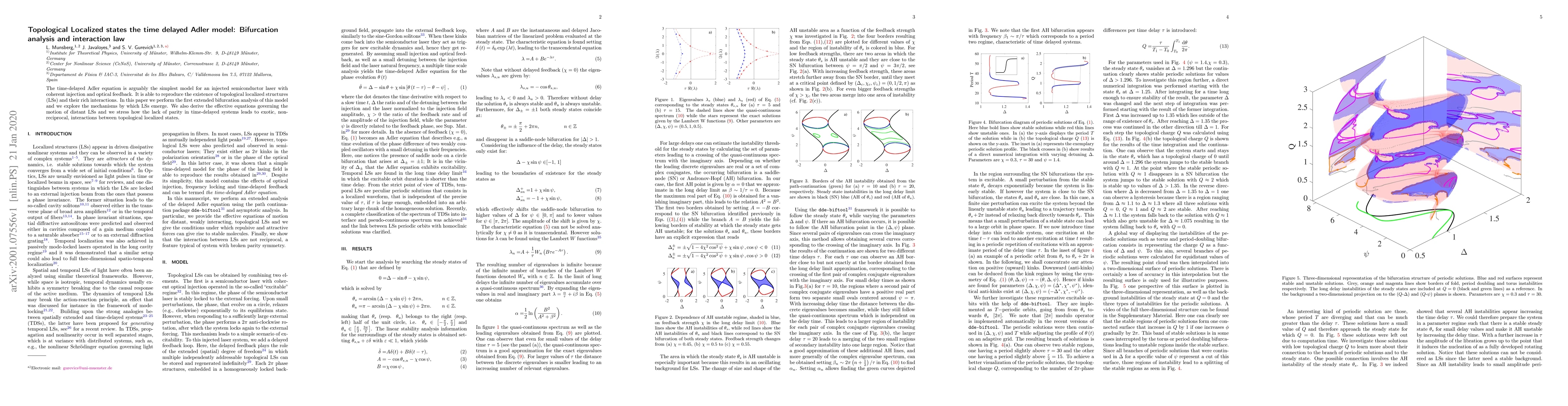 The time-delayed Adler equation is arguably the simplest model for an injected semiconductor laser with coherent injection and optical feedback. It is able to reproduce the existence of topological localized structures (LSs) and their rich interactions. In this paper we perform the first extended bifurcation analysis of this model and we explore the mechanisms by which LSs emerge. We also derive the effective equations governing the motion of distant LSs and we stress how the lack of parity in time-delayed systems leads to exotic, non-reciprocal, interactions between topological localized states.