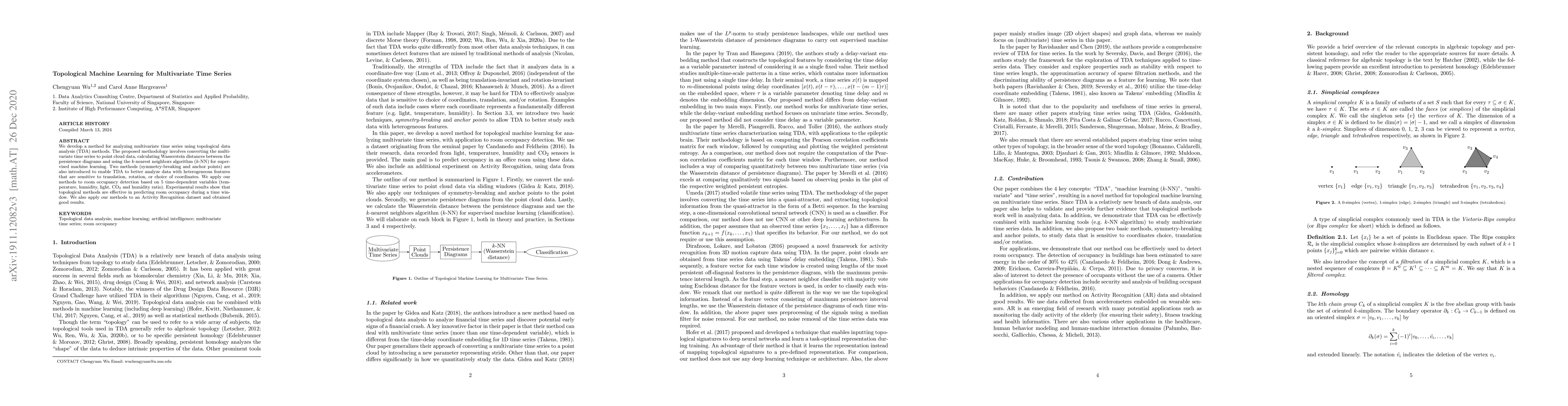 This paper proposes a topological machine learning framework for analyzing multivariate time series using TDA, converting data to point clouds, and employing Wasserstein distances and $k$-NN for supervised learning. It introduces symmetry-breaking and anchor points methods to handle heterogeneous features, demonstrating effectiveness in room occupancy detection and activity recognition.