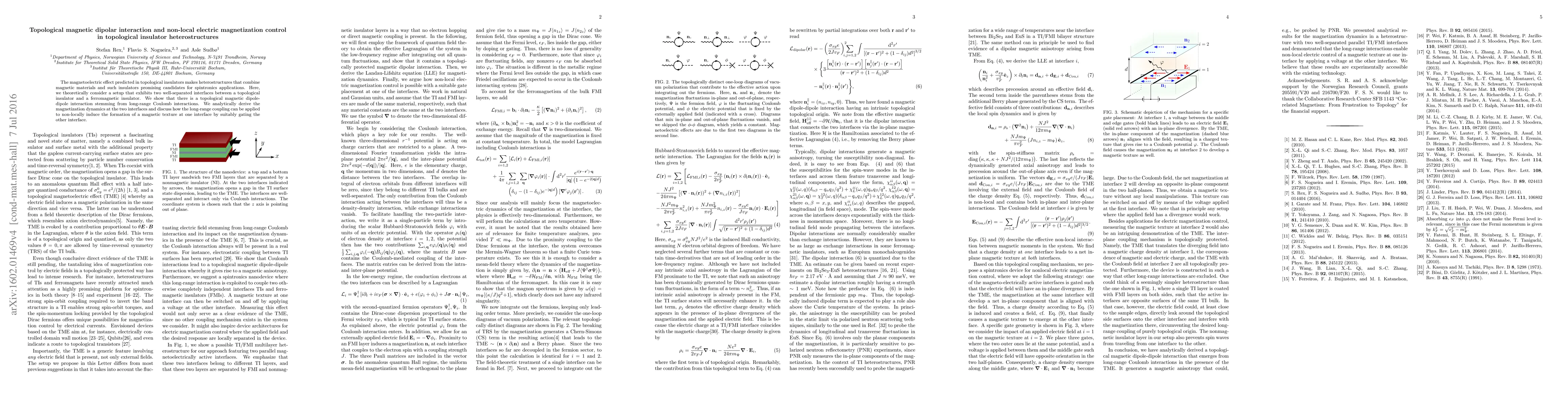 The magnetoelectric effect predicted in topological insulators makes heterostructures that combine magnetic materials and such insulators promising candidates for spintronics applications. Here, we theoretically consider a setup that exhibits two well-separated interfaces between a topological insulator and a ferromagnetic insulator. We show that there is a topological magnetic dipole-dipole interaction stemming from long-range Coulomb interactions. We analytically derive the magnetization dynamics at the two interfaces and discuss how the long-range coupling can be applied to non-locally induce the formation of a magnetic texture at one interface by suitably gating the other interface.