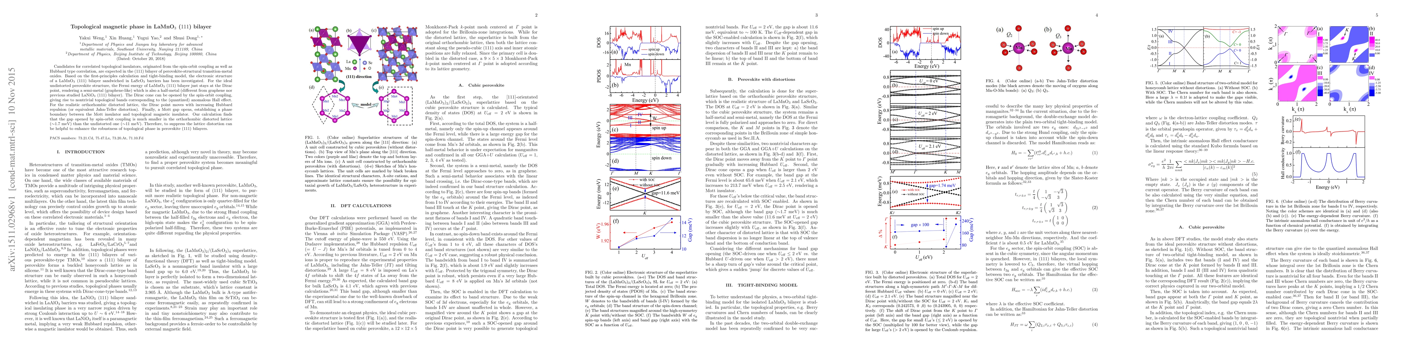 This research investigates the electronic structure of LaMnO$_3$ (111) bilayers using first-principles calculations and tight-binding models, finding a topological magnetic phase arising from spin-orbit coupling. In undistorted structures, the Fermi energy aligns with the Dirac point, resulting in a semi-metal, while orthorhombic distortion shifts this point, creating a Mott gap and influencing topological phase stability.