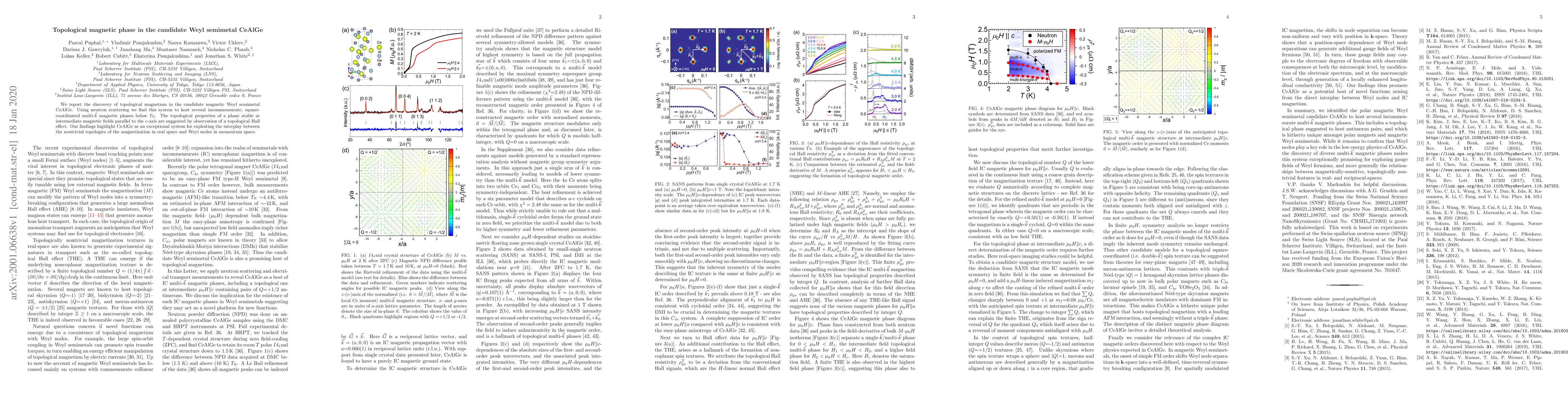 The research discovers topological magnetism in the candidate Weyl semimetal CeAlGe, revealing several incommensurate magnetic phases via neutron scattering. A topological Hall effect suggests a topological phase stable at intermediate magnetic fields, underscoring CeAlGe's potential for exploring the interplay between magnetic and Weyl semimetal topologies.