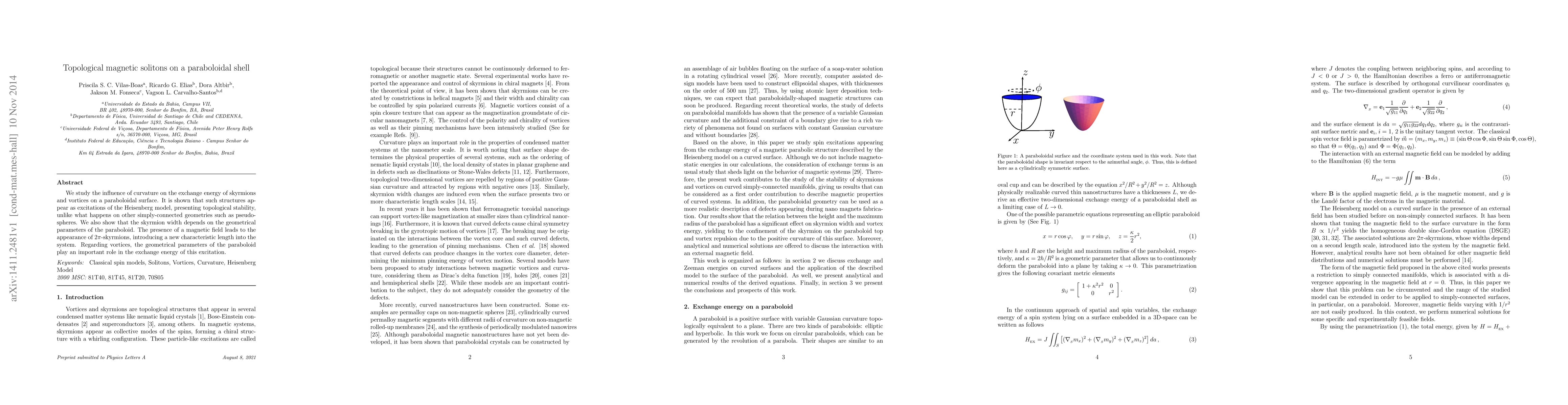 We study the influence of curvature on the exchange energy of skyrmions and vortices on a paraboloidal surface. It is shown that such structures appear as excitations of the Heisenberg model, presenting topological stability, unlike what happens on other simply-connected geometries such as pseudospheres. We also show that the skyrmion width depends on the geometrical parameters of the paraboloid. The presence of a magnetic field leads to the appearance of $2\pi$-skyrmions, introducing a new characteristic length into the system. Regarding vortices, the geometrical parameters of the paraboloid play an important role in the exchange energy of this excitation.