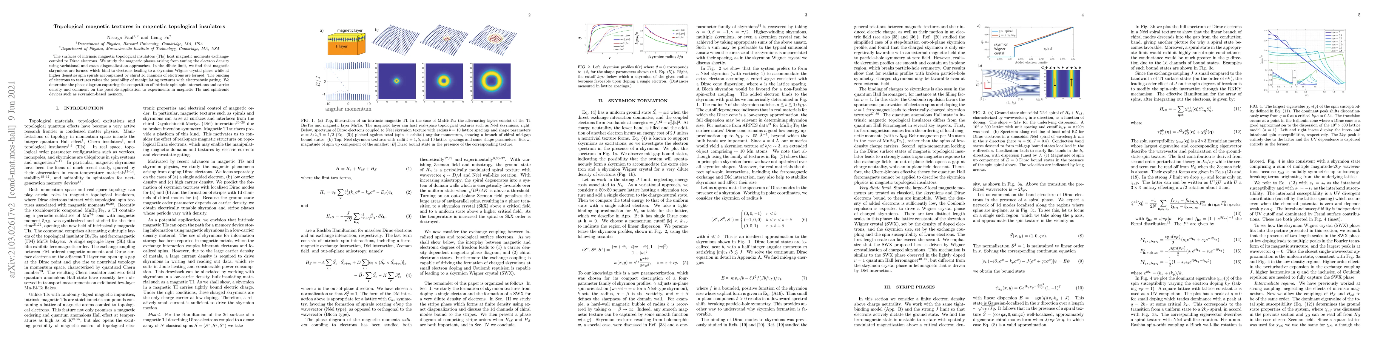 The surfaces of intrinsic magnetic topological insulators (TIs) host magnetic moments exchange-coupled to Dirac electrons. We study the magnetic phases arising from tuning the electron density using variational and exact diagonalization approaches. In the dilute limit, we find that magnetic skrymions are formed which bind to electrons leading to a skyrmion Wigner crystal phase while at higher densities spin spirals accompanied by chiral 1d channels of electrons are formed. The binding of electrons to textures raises the possibility of manipulating textures with electrostatic gating. We determine the phase diagram capturing the competition of intrinsic spin-spin interactions and carrier density and comment on the possible application to experiments in magnetic TIs and spintronic devices such as skyrmion-based memory.