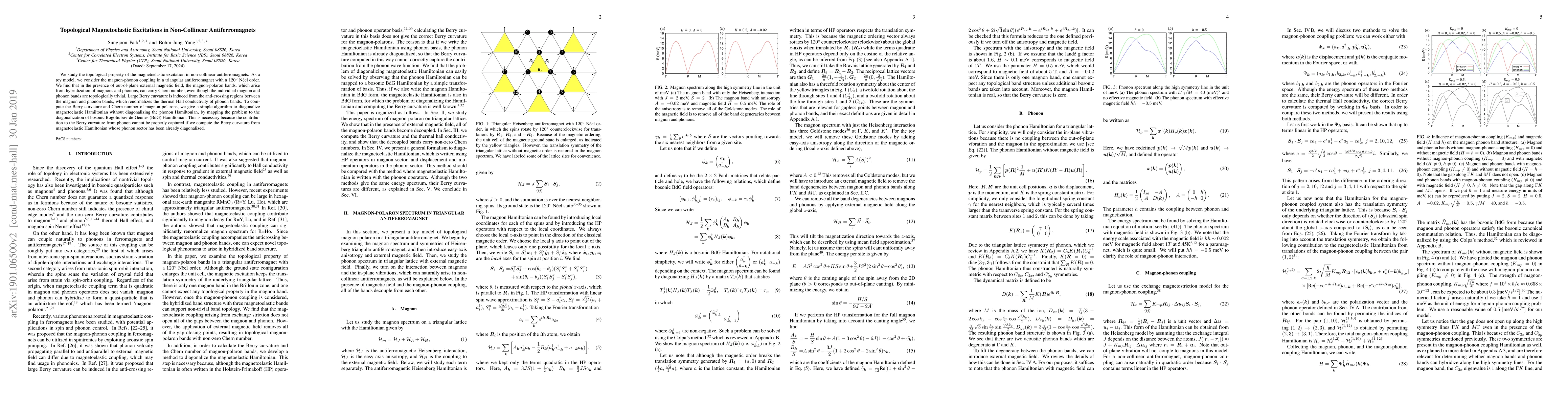 We study the topological property of the magnetoelastic excitation in non-collinear antiferromagnets. As a toy model, we consider the magnon-phonon coupling in a triangular antiferromagnet with a $120^\circ$ N\`eel order. We find that in the presence of out-of-plane external magnetic field, the magnon-polaron bands, which arise from hybridization of magnons and phonons, can carry Chern number, even though the individual magnon and phonon bands are topologically trivial. Large Berry curvature is induced from the anti-crossing regions between the magnon and phonon bands, which renormalizes the thermal Hall conductivity of phonon bands. To compute the Berry curvature and Chern number of magnon-polarons, we give a simple algorithm to diagonalize magnetoelastic Hamiltonian without diagonalizing the phonon Hamiltonian, by mapping the problem to the diagonalization of bosonic Bogoliubov-de-Gennes (BdG) Hamiltonian. This is necessary because the contribution to the Berry curvature from phonon cannot be properly captured if we compute the Berry curvature from magnetoelastic Hamiltonian whose phonon sector has been already diagonalized.
