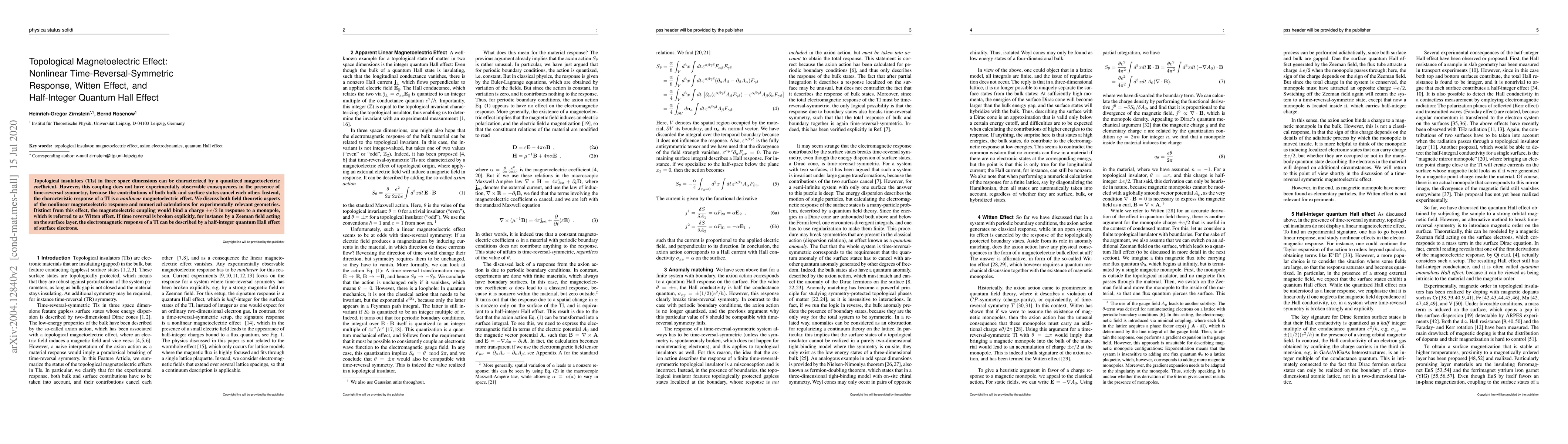 This paper investigates topological insulators in three dimensions, highlighting their quantized magnetoelectric coefficient and the nonlinear magnetoelectric effect that arises in the absence of time-reversal symmetry. It also explores the Witten effect and the half-integer quantum Hall effect when time reversal is explicitly broken.