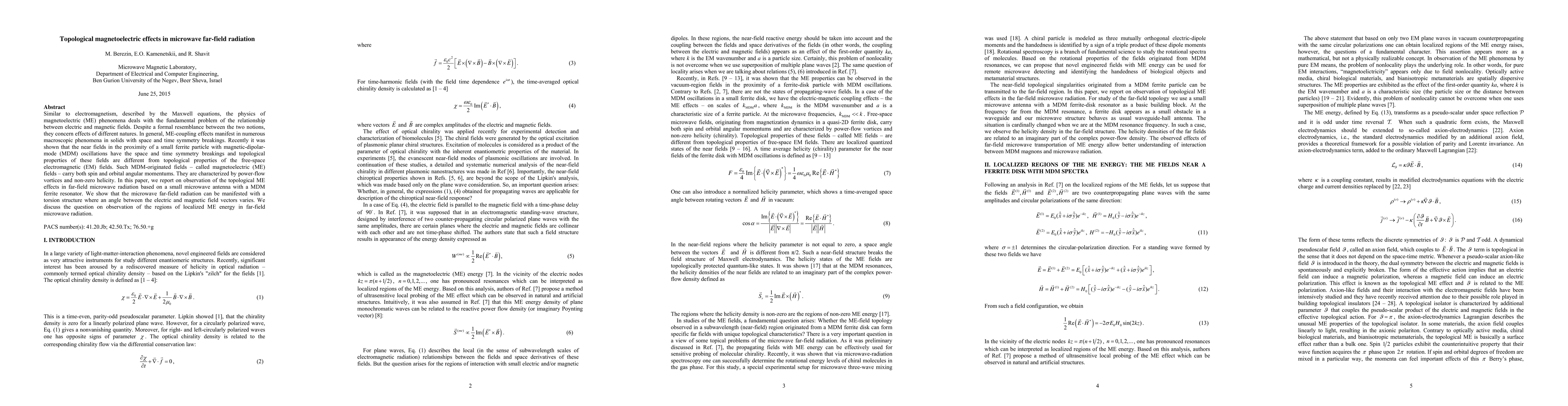 Researchers observe topological magnetoelectric effects in microwave far-field radiation using a small ferrite antenna, revealing power flow vortices and non-zero helicity.