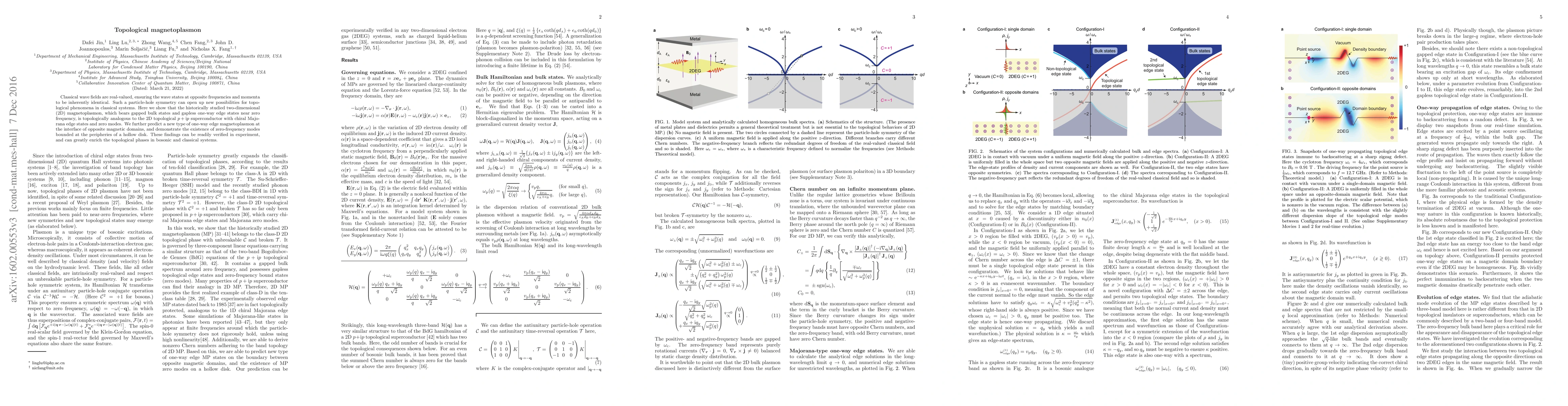 Classical wave fields are real-valued, ensuring the wave states at opposite frequencies and momenta to be inherently identical. Such a particle-hole symmetry can open up new possibilities for topological phenomena in classical systems. Here we show that the historically studied two-dimensional (2D) magnetoplasmon, which bears gapped bulk states and gapless one-way edge states near zero frequency, is topologically analogous to the 2D topological $p+\Ii p$ superconductor with chiral Majorana edge states and zero modes. We further predict a new type of one-way edge magnetoplasmon at the interface of opposite magnetic domains, and demonstrate the existence of zero-frequency modes bounded at the peripheries of a hollow disk. These findings can be readily verified in experiment, and can greatly enrich the topological phases in bosonic and classical systems.