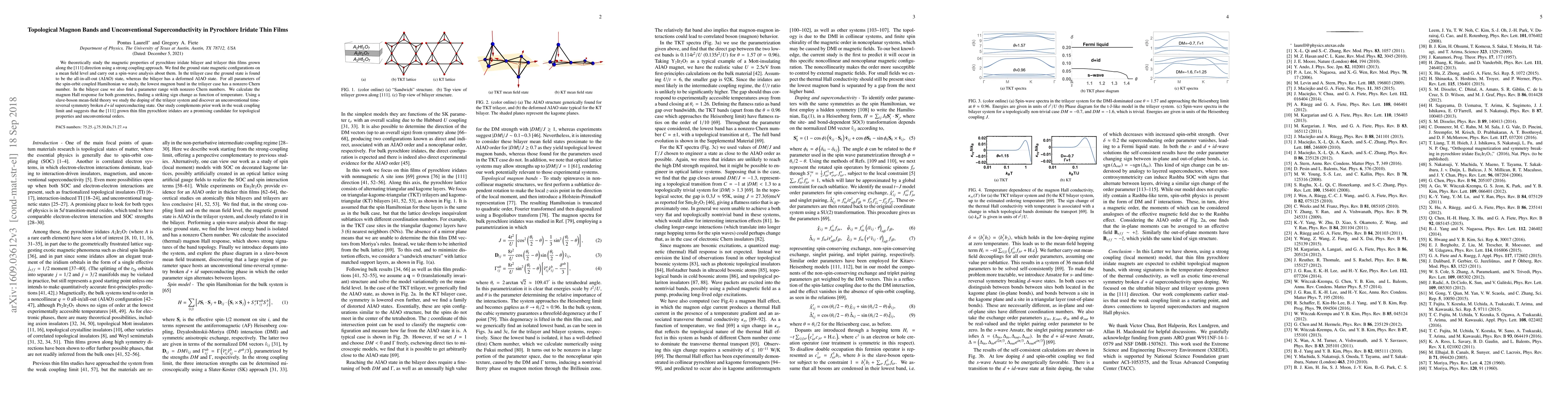 We theoretically study the magnetic properties of pyrochlore iridate bilayer and trilayer thin films grown along the $[111]$ direction using a strong coupling approach. We find the ground state magnetic configurations on a mean field level and carry out a spin-wave analysis about them. In the trilayer case the ground state is found to be the all-in-all-out (AIAO) state, whereas the bilayer has a deformed AIAO state. For all parameters of the spin-orbit coupled Hamiltonian we study, the lowest magnon band in the trilayer case has a nonzero Chern number. In the bilayer case we also find a parameter range with nonzero Chern numbers. We calculate the magnon Hall response for both geometries, finding a striking sign change as function of temperature. Using a slave-boson mean-field theory we study the doping of the trilayer system and discover an unconventional time-reversal symmetry broken $d+id$ superconducting state. Our study complements prior work in the weak coupling limit and suggests that the $[111]$ grown thin film pyrochlore iridates are a promising candidate for topological properties and unconventional orders.