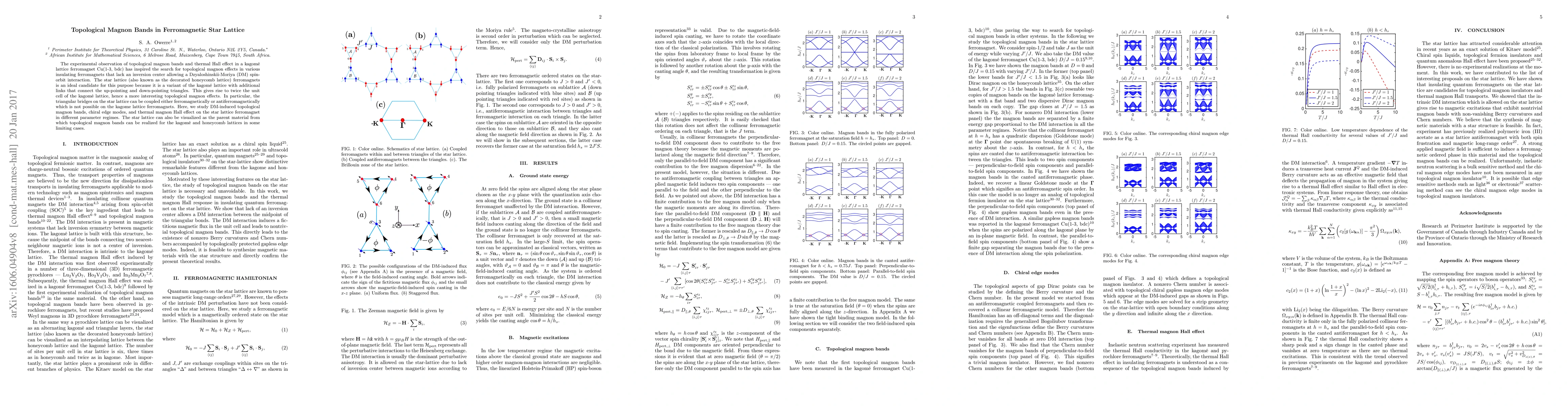 This paper investigates topological magnon bands and thermal Hall effects in star lattice ferromagnets, exploring DM-induced magnon phenomena and chiral edge modes, and comparing them to kagomé lattice systems. The study highlights the star lattice's unique features due to its additional links and potential for diverse coupling configurations.
